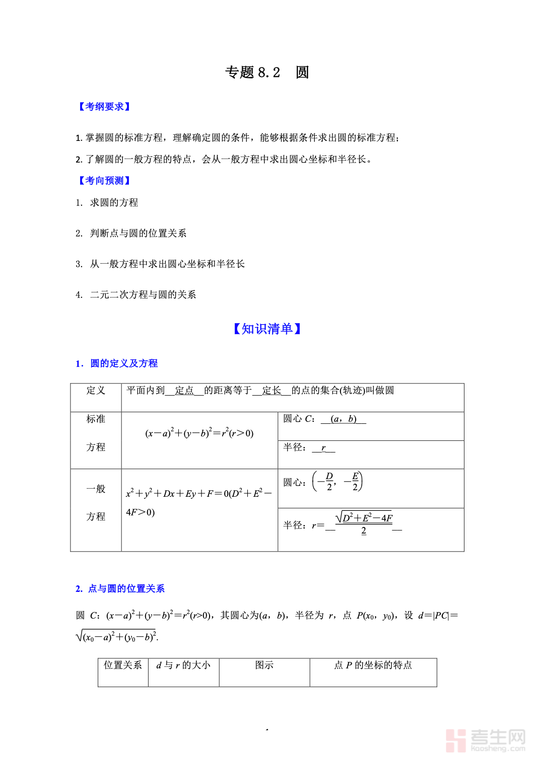 本资料为8.2 圆 高考数学一轮艺体生基础复习讲义(新高考)(学生版),专为艺体生一轮复习量身打造,紧扣新高考考纲,侧重基础题型与得分要点。内容系统讲解圆的标准方程、一般方程、直线与圆的位置关系、点与圆的位置关系等核心知识点,突出公式理解、基础计算和通解通法,难度适中、循序渐进。讲义包含知识点梳理、典型例题、详细步骤、易错提醒及配套练习,结构清晰、实用性强,方便教师课堂教学与知识点梳理。助力艺体生快速夯实圆的相关基础,掌握解题套路,提升一轮复习效率,为高考数学解析几何备考筑牢基础。