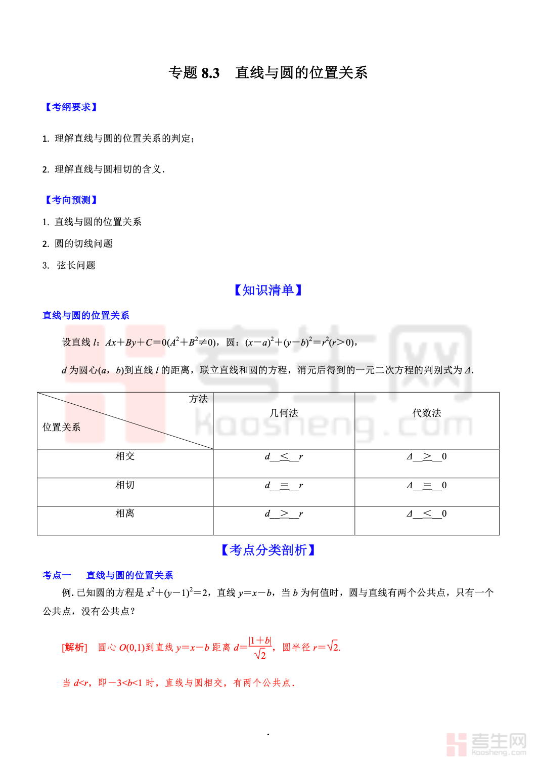 本资料为8.3 直线与圆的位置关系 高考数学一轮艺体生基础复习讲义(新高考)(教师版),专为艺体生一轮复习定制,紧扣新高考考纲,聚焦基础得分点。内容系统梳理直线与圆的三种位置关系判定方法、弦长公式、切线方程及最值问题等核心考点,侧重基础应用与通法讲解,简化复杂推理,难度适配艺体生复习需求。讲义包含知识点梳理、典型例题、分步解析、易错点警示及课堂配套练习,结构清晰、实用性强,便于教师开展针对性教学。助力艺体生快速掌握核心解题思路,夯实解析几何基础,提升一轮复习效率与应试得分能力,为高考数学备考筑牢关键根基。