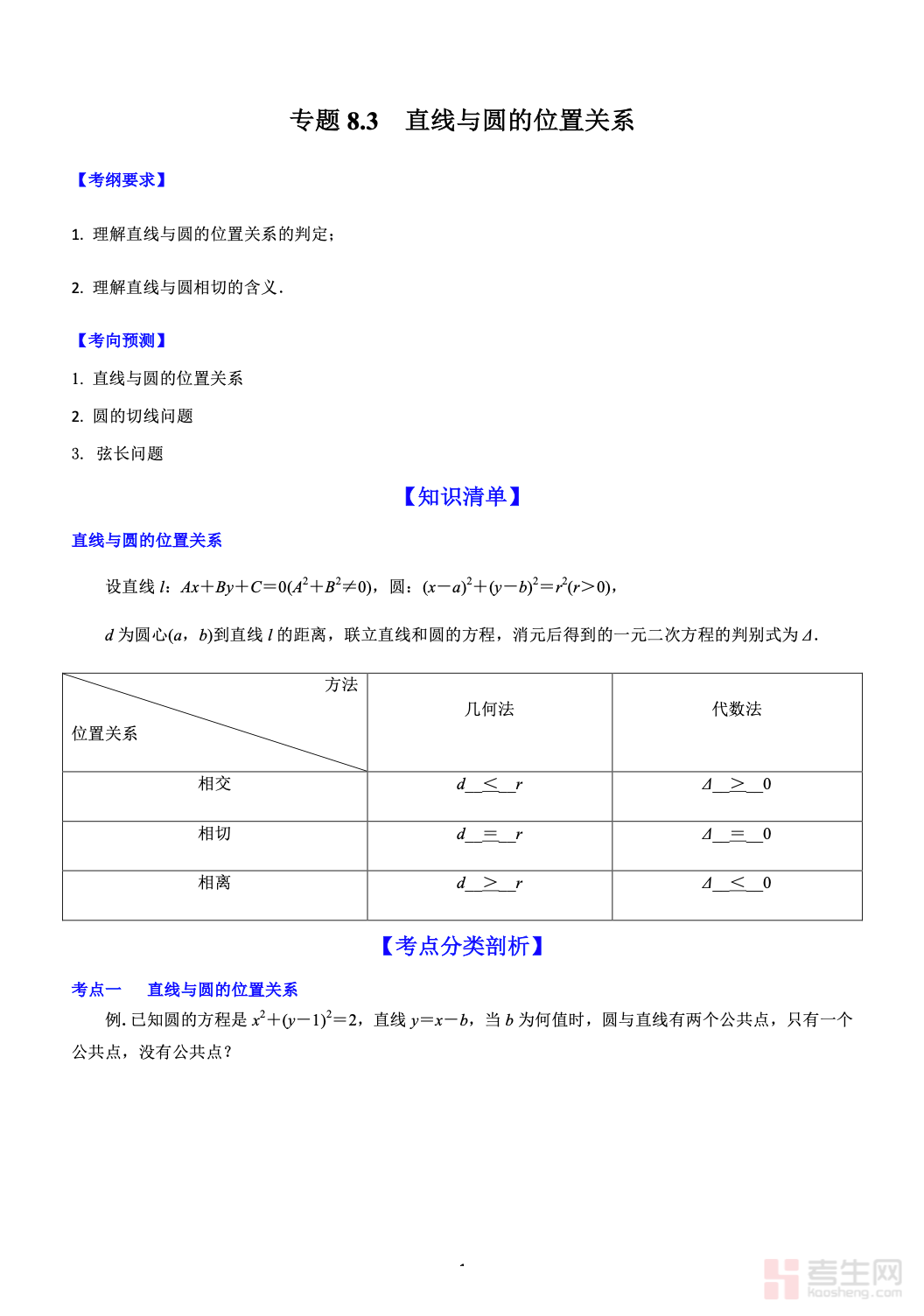 本资料为8.3 直线与圆的位置关系 高考数学一轮艺体生基础复习讲义(新高考)(教师版),专为艺体生一轮复习定制,紧扣新高考考纲,聚焦基础得分点。内容系统梳理直线与圆的三种位置关系判定方法、弦长公式、切线方程及最值问题等核心考点,侧重基础应用与通法讲解,简化复杂推理,难度适配艺体生复习需求。讲义包含知识点梳理、典型例题、分步解析、易错点警示及课堂配套练习,结构清晰、实用性强,便于教师开展针对性教学。助力艺体生快速掌握核心解题思路,夯实解析几何基础,提升一轮复习效率与应试得分能力,为高考数学备考筑牢关键根基。