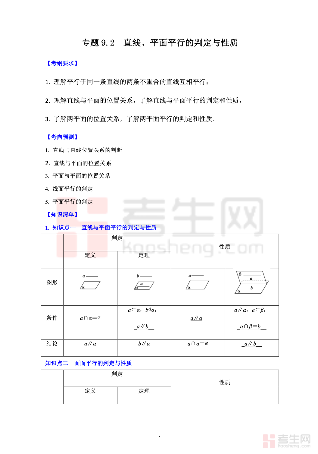 本资料为 9.2 直线、平面平行的判定与性质 高考数学一轮艺体生基础复习讲义(新高考)(教师版),专为艺体生一轮复习量身打造,紧扣新高考考纲,侧重基础与得分点。内容系统讲解空间中直线与平面、平面与平面平行的判定定理及性质定理,强化定理理解、规范证明步骤与典型题型训练,难度适中、循序渐进。讲义包含知识点梳理、例题精讲、详细解析、易错点提示及配套练习,结构清晰、实用性强,方便教师教学使用。助力艺体生快速掌握立体几何平行问题核心思路,夯实空间几何基础,提升一轮复习效率与应试解题能力,为高考数学备考筑牢基础。