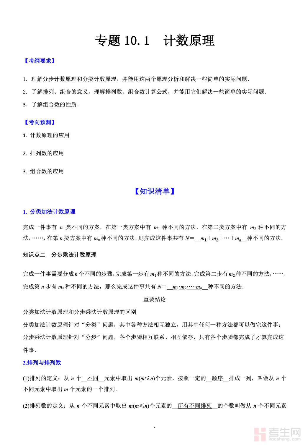 本资料为10.1 计数原理 高考数学一轮艺体生基础复习讲义(新高考)(教师版),专为艺体生一轮复习量身设计,紧扣新高考考纲,聚焦基础与高频考点。内容系统讲解分类加法计数原理与分步乘法计数原理,结合排列组合基础题型,强化思路分析与规范解题步骤,难度适中、循序渐进。讲义包含知识点梳理、典型例题、详细解析、易错点提醒及配套练习,结构清晰、实用性强,方便教师课堂教学使用。助力艺体生快速掌握计数原理核心方法,夯实概率统计模块基础,提升一轮复习效率与应试得分能力,为高考数学备考筑牢根基。