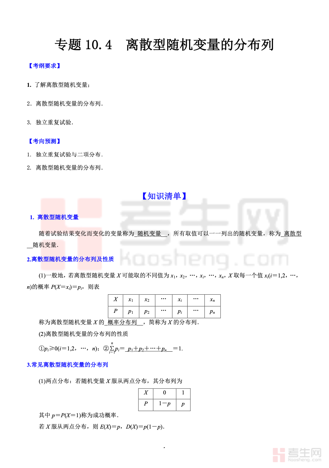本资料为10.4 离散型随机变量的分布列 高考数学一轮艺体生基础复习讲义(新高考)(教师版),专为艺体生一轮复习量身打造,紧扣新高考考纲,聚焦基础与高频考点。内容系统讲解离散型随机变量、分布列概念、期望、方差及常见概率模型等核心知识点,侧重基础理解、公式应用与解题步骤规范,难度适中、循序渐进。讲义包含知识点梳理、典型例题、详细解析、易错提醒及配套练习,结构清晰、实用性强,方便教师教学使用。助力艺体生快速掌握分布列核心解法,夯实统计概率模块基础,提升一轮复习效率与应试得分能力,为高考数学备考筑牢根基。