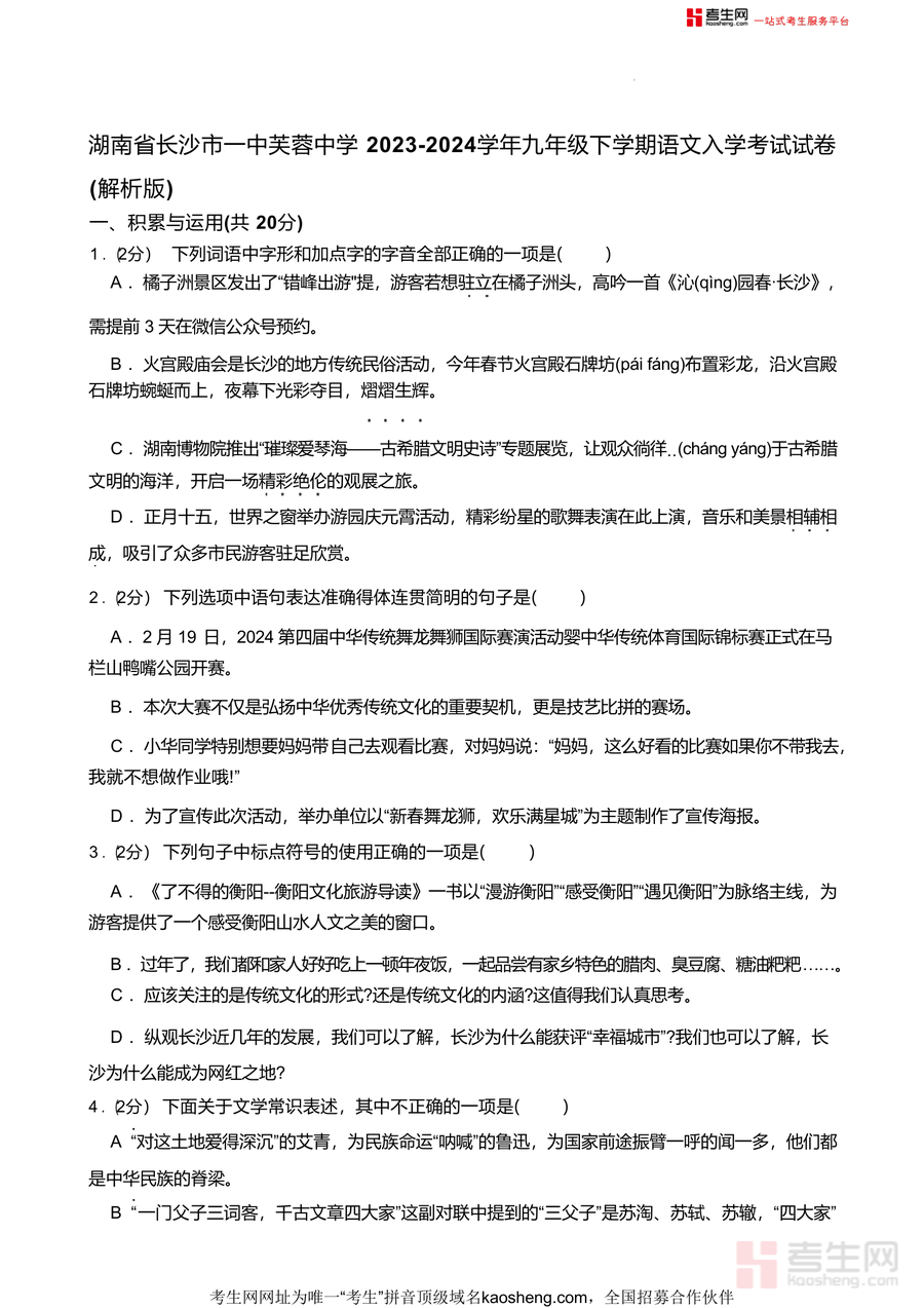 《湖南省长沙市一中芙蓉中学2023-2024学年九年级下学期入学考试语文试卷.docx》是一份针对九年级学生下学期入学阶段的语文综合评估资料,涵盖积累与运用、阅读与理解(含诗歌鉴赏、文言文阅读、非文学作品阅读及文学作品阅读)等核心模块,以解析版形式呈现完整试题及详细答案解析,其特色在于紧密贴合长沙本地教学实际,融入湖湘文化元素如橘子洲、火宫殿等地域素材,并注重对学生应试能力与核心素养的双重考查.