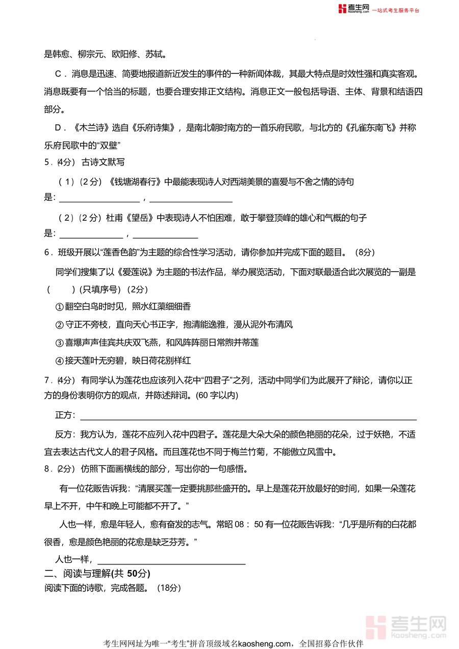 该资料主要用于九年级学生入学后的学业水平检测与中考备考规划参考,适用于学生自主模拟训练以熟悉中考题型结构与难度,也可作为教师课堂教学或家长辅导孩子时的数据支撑.通过完成这份试卷并对照解析版内容分析错题,学生能精准定位薄弱环节如古诗文默写、文言文翻译或现代文阅读理解等,进而针对性强化训练;同时,试卷中融入湖湘文化相关题目如"莲香色韵"综合性学习活动设计等,有助于学生在备考过程中提升对本土文化认知,增强应试能力与文化素养融合.