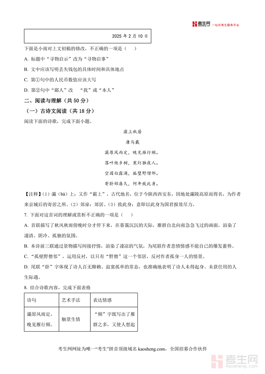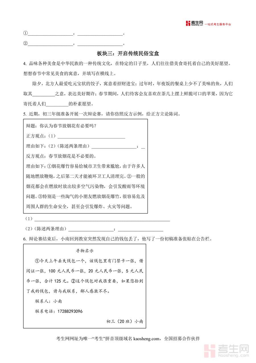 该资料可作为九年级学生开学前自我检测的重要工具,也适用于教师开展新学期学情诊断及教学规划参考;使用场景包括学生自主刷题测评、班级统一模考训练及教师备课资源补充;用户价值在于帮助学生快速定位寒假学习漏洞,强化对传统文化类考点(如汉字字义推测、诗词默写)及阅读题型(古诗文分析、非连续性文本解读) 的掌握;备考优势体现在其源自名校真题,命题规范且针对性强,能有效提升学生应试能力.
