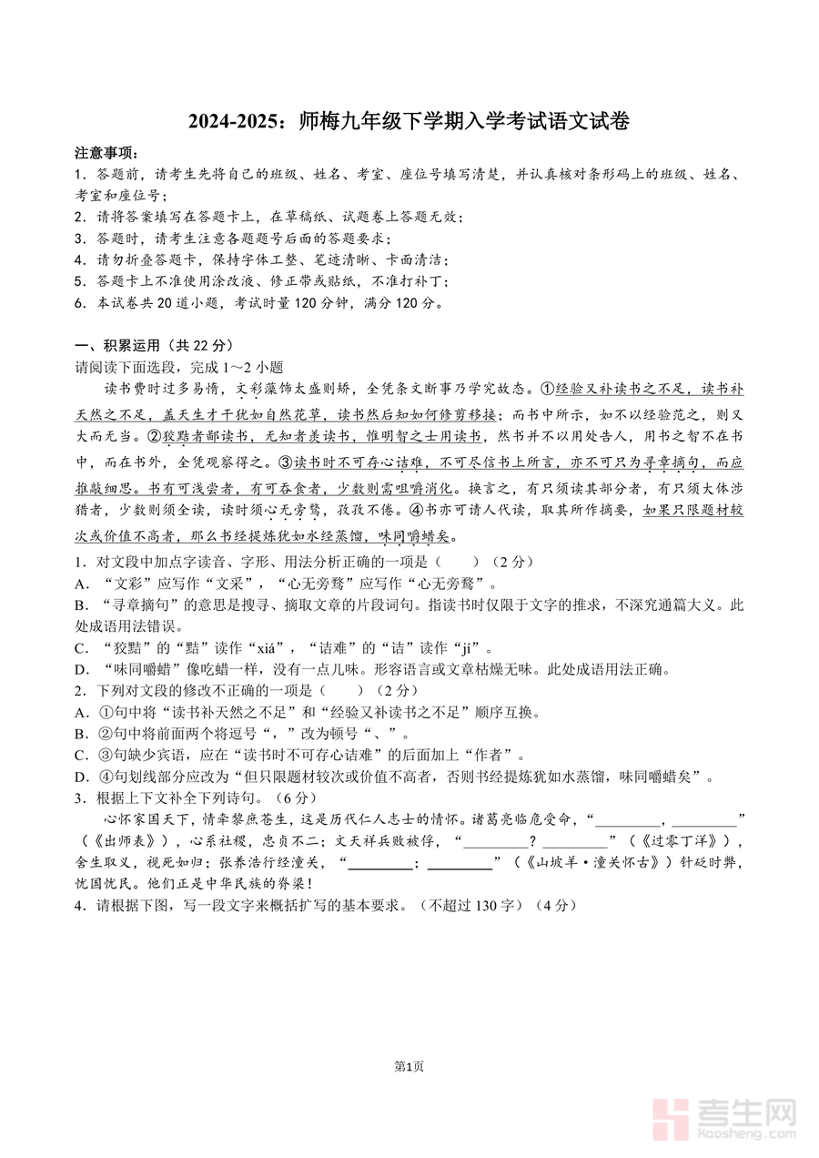 该试题可作为九年级学生寒假自主复习后的模拟测试工具,帮助学生精准定位字音字形、古诗文理解等薄弱环节;也可作为教师课堂学情诊断及针对性教学参考依据;其核心价值在于通过真题演练提升学生应试能力,让学生熟悉中考题型结构与难度梯度,依托名校命题思路提前适应九年级下学期学习节奏与考试要求,为后续中考系统复习奠定坚实基础。
