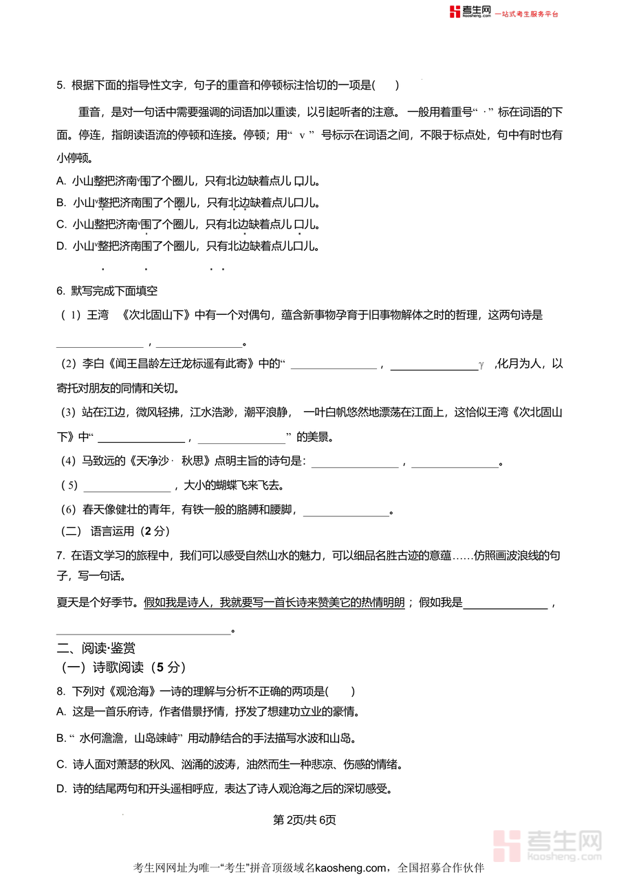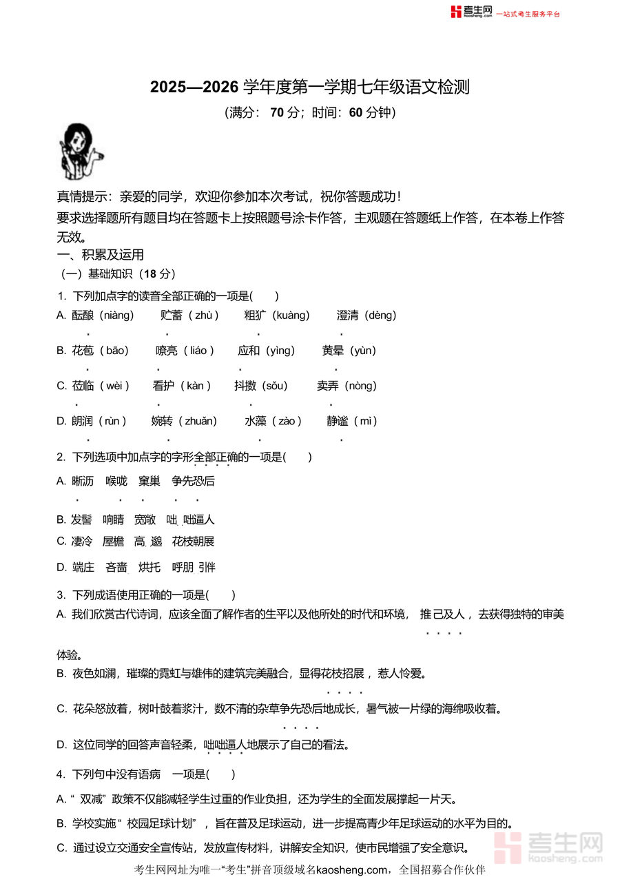 《精品解析:山东省青岛市城阳区第六中学2025-2026学年七年级上学期月考语文试题(原卷版)docx》是一份精准匹配青岛城阳六中七年级语文教学进度与学情特点的标准化月考真题资料包含积累及运用(基础知识如字音字形辨析、成语使用、病句修改;语言运用如仿写)、阅读·鉴赏(诗歌理解分析、《朝花夕拾》名著常识判断、《咏雪》《陈太丘与友期行》文言文实词虚词及翻译、现代文阅读理解)等完整模块题型覆盖选择、默写、翻译、简答等考试常见形式特色在于严格遵循70分满分60分钟时限设置贴合教材重点如《次北固山下》《闻王昌龄左迁龙标遥有此寄》等古诗文考点及初中语文核心能力要求