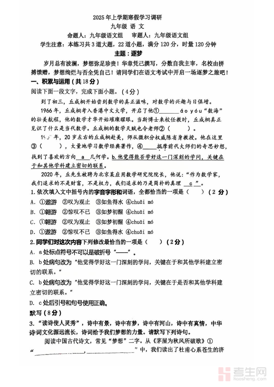 这份试卷的核心用途是帮助九年级学生精准评估寒假学习效果,快速适应下学期中考冲刺阶段的学习节奏;使用场景包括学生自主刷题巩固知识点、教师用于课堂讲评或学情分析、家长辅助孩子制定个性化复习计划。用户价值体现在通过真题练习熟悉中考题型结构与答题规范,有效提升应试能力;备考优势在于真题的权威性——作为名校入学考试原题,其难度与考点分布高度贴合长沙中考趋势,能更精准地暴露学生的知识漏洞,助力针对性补强。