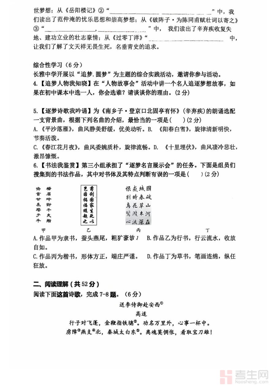 《_湖南省长沙市长雅中学2024-2025学年九年级下学期入学考试语文试卷.pdf》是一份由长沙知名中学长雅中学命制的九年级下学期入学考试官方真题资料,核心定位为九年级学生寒假后知识检测与中考备考衔接的关键备考资料。试卷内容严格遵循长沙中考语文命题框架,涵盖基础积累与运用(字音字形、病句修改、古诗文默写等)、现代文阅读(记叙文、议论文双文本阅读)、古诗文阅读(课内文言文对比阅读+课外古诗赏析)及写作(命题作文)四大模块;特色亮点在于结合长雅中学教学特色与长沙本地文化元素(如湖湘名人、地域景观等)设计题目,兼具针对性与实践性。