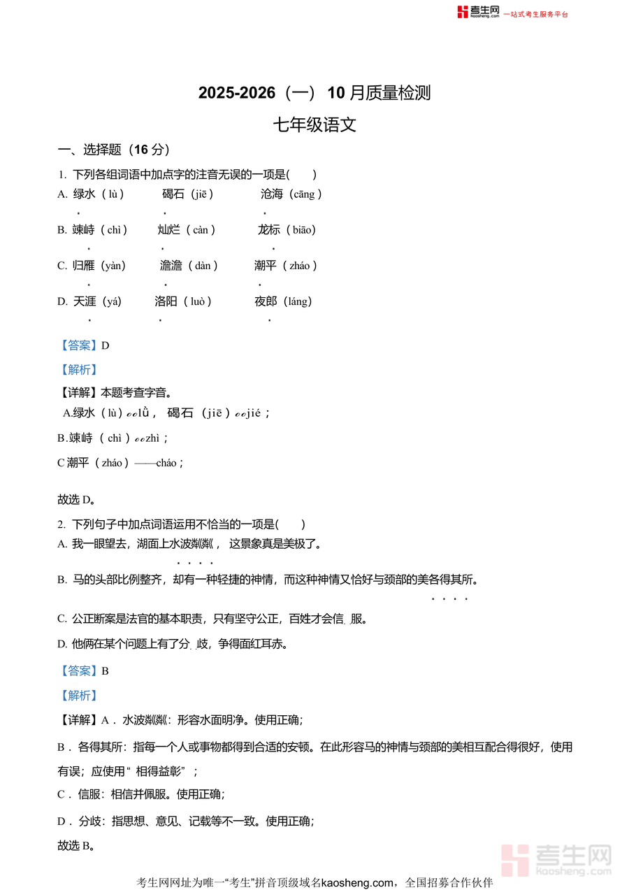 《精品解析:山东省青岛市市南区青岛超银中学2025-2026学年七年级上学期10月月考语文试题(解析版)》是一份针对七年级上学期语文阶段检测的高质量备考资料与真题解析合集,涵盖字音字形辨析、词语运用判断、文言虚词用法分析、古诗文默写及鉴赏等核心题型。解析部分不仅给出标准答案,更通过逐题拆解考点(如字音题中"绿水"的正确读音"lǜ"、文言文中"委"字"舍弃"之义)、梳理易错点、补充解题思路,帮助学生精准把握知识细节,形成清晰的答题逻辑框架。