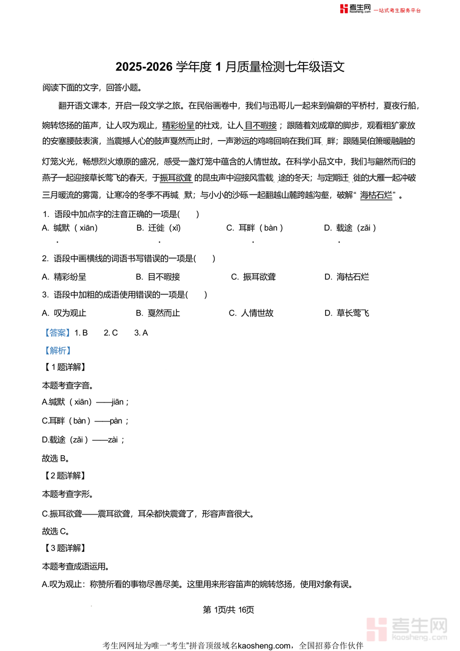 《精品解析:山东省青岛市市南区青岛超银中学2025-2026学年七年级上学期1月月考语文试题(解析版).docx》是一份针对该校七年级上学期语文月考真题进行深度剖析与解读专业备考资料,主要涵盖字音字形辨析、成语运用判断、病句修改分析、古诗文积累默写及名著阅读等核心题型,特色亮点在于每个题目均配备详细解题思路与答案解析,不仅明确正确选项,更深入剖析错误选项根源,助力学生精准掌握考点知识体系,有效提升应试能力。