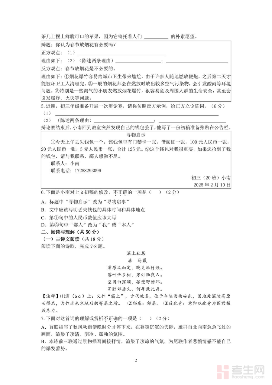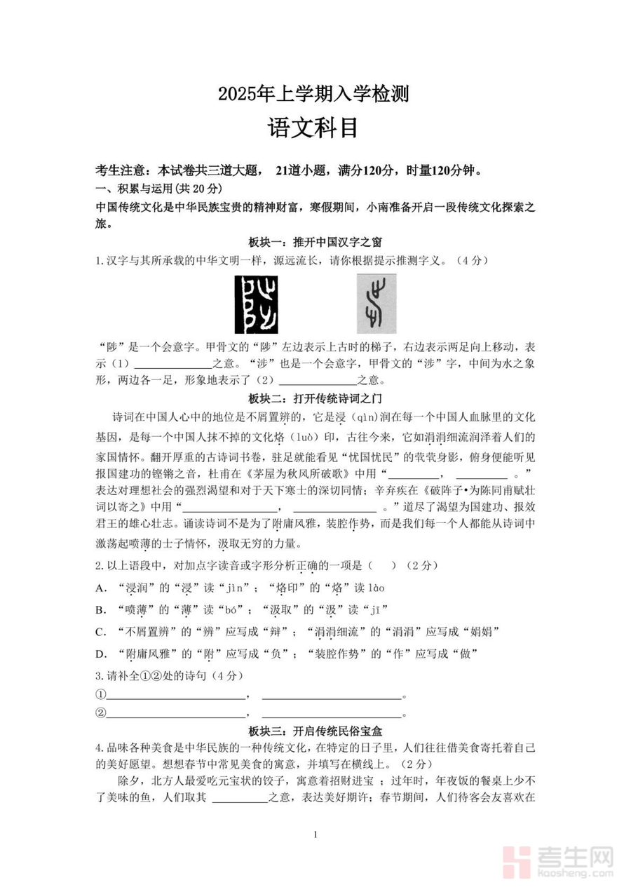 《(语文)2025年上学期入学检测.pdf》是一份面向2025年秋季入学新生的语文能力综合评估与入学备考资料,内容覆盖基础字词积累与运用、古诗文背诵及理解、现代文阅读理解(含记叙文、说明文等体裁)、文言文初步阅读及写作表达(含命题作文与应用文)五大核心模块。资料严格依据教育部最新义务教育语文课程标准及高中语文课程标准设计,融入近年基础教育阶段语文考点趋势与命题规律,题型设置兼顾基础性与拓展性,每个模块均配备典型例题与梯度化训练题,特色亮点在于强化入学前后教学内容的衔接性,突出对学生语文核心素养(语言建构与运用、思维发展与提升等)的综合考察。
