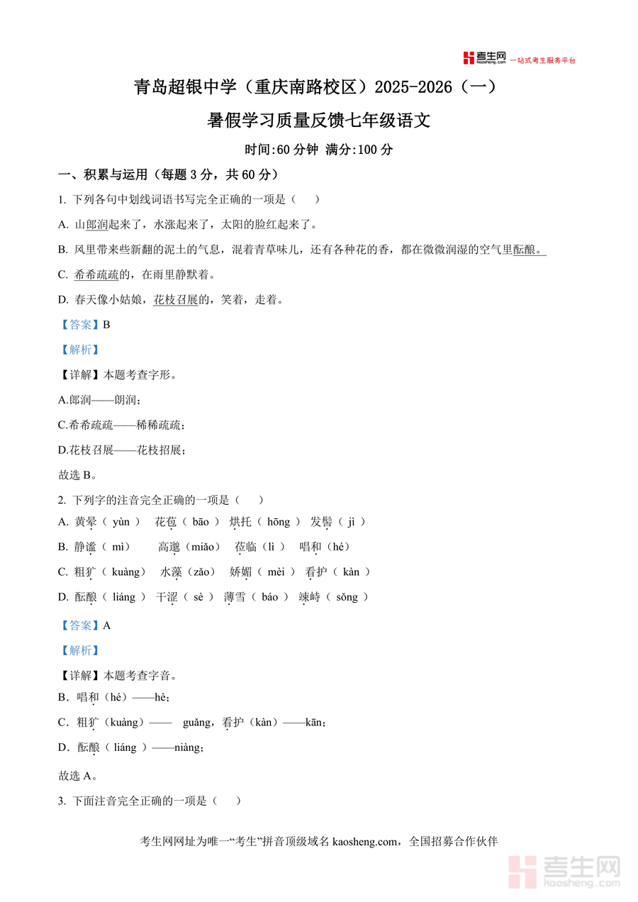 《精品解析:山东省青岛市市南区青岛超银中学2025-2026学年七年级上学期开学语文试题(解析版).docx》是一份针对七年级新生开学适应性检测需求设计开发的高质量备考资料,其核心定位为精准反映该校教学要求与考查重点,助力学生快速适应初中语文学习节奏。文件内容覆盖了初中语文基础能力考查的核心模块,包括汉字字音字形辨析、成语运用、病句修改等积累与运用题型,以及名著阅读与古诗文鉴赏等综合能力题型。其特色亮点在于每道题目均配备了详尽且专业级别的真题解析,不仅提供标准答案,更深入剖析考点设置意图及常见错误原因,帮助使用者构建清晰解题思路,有效提升应试能力。