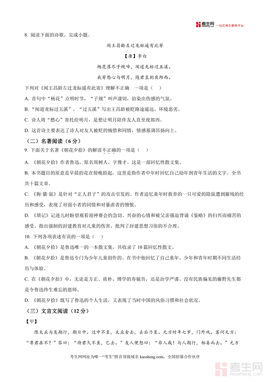 《精品解析:山东省青岛市某校2025-2026学年七年级上学期10月月考语文试题(原卷版)(1).docx》是一份针对七年级上学期语文阶段性学习成果检测的真题资料核心定位清晰主要内容覆盖积累运用板块含字音字形诗文默写等基础题型阅读理解板块包含诗歌阅读《次北固山下》《闻王昌龄左迁龙标遥有此寄》等篇目名著阅读聚焦《朝花夕拾》文言文选取《陈太丘与友期行》《识李·观虎》等经典文本现代文阅读以散文《豆包儿》为例特色亮点在于贴合青岛本地教学实际融入胶州大秧歌地域文化元素题型设置遵循新课标要求能真实反映学生阶段知识掌握情况