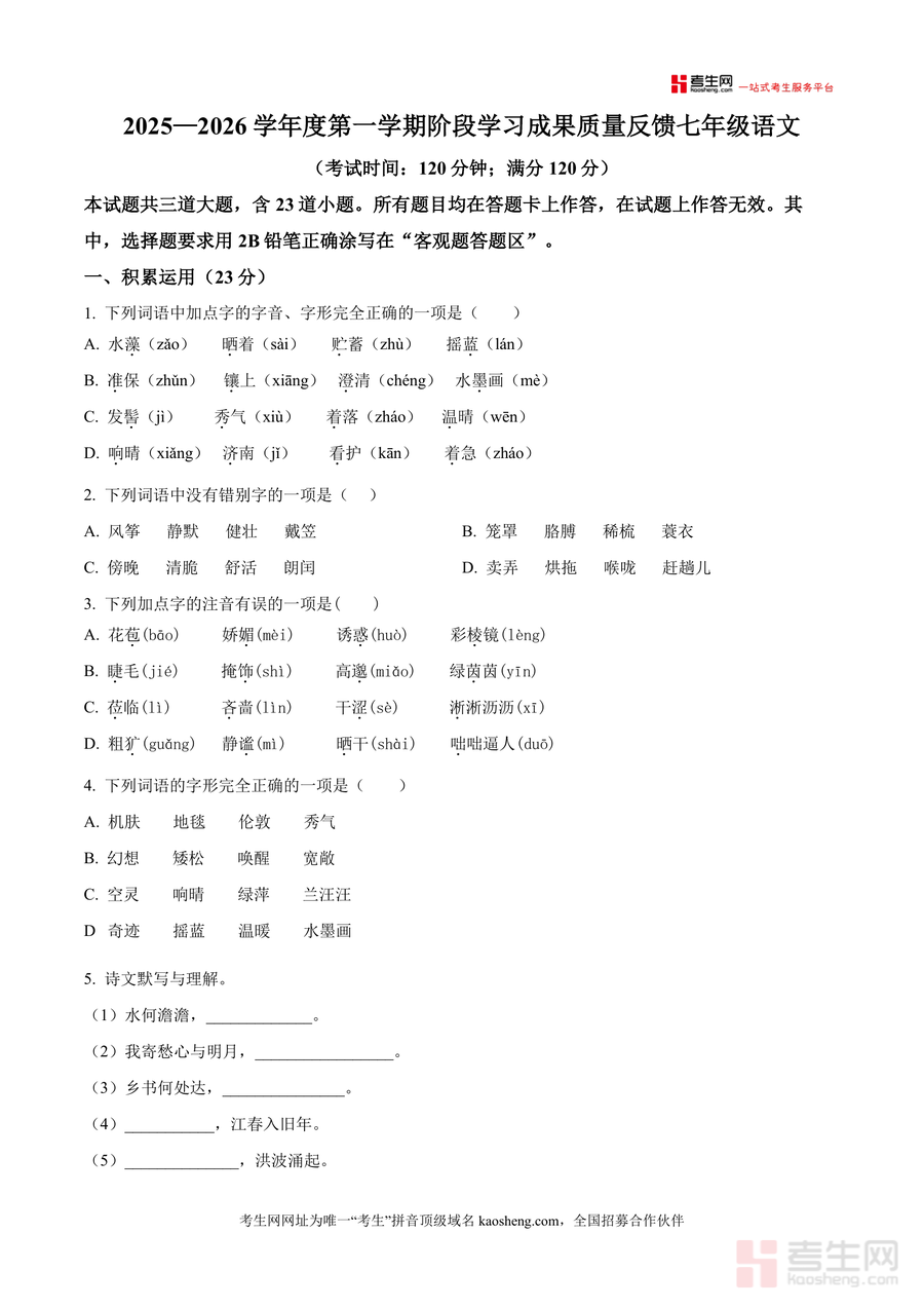 《精品解析:山东省青岛市某校2025-2026学年七年级上学期10月月考语文试题(原卷版)》是一份针对七年级上学期语文月考备考设计 的高质量真题资料,涵盖积累运用、阅读理解(含诗歌、名著、文言文及现代文)等核心板块,完整呈现120分钟/120分标准试卷结构,题型设计贴合青岛本地教学进度,包含字音字形辨析、古诗文默写等基础考点及《朝花夕拾》名著阅读等拓展内容,具有较强 的针对性与实用性。