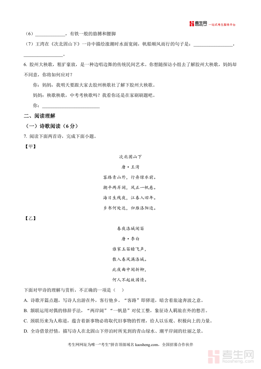 本资料适用于青岛市及周边地区七年级学生进行语文月考备考,亦可供初中语文教师用于教学资源补充或家长辅导孩子学习使用。其严格遵循本地教学大纲要求,能够有效对接教学重点,为使用者提供不可替代的真题训练体验,长期使用可帮助学生构建系统知识体系,为后续期中期末考试奠定坚实基础,具有重要 的学习参考意义。