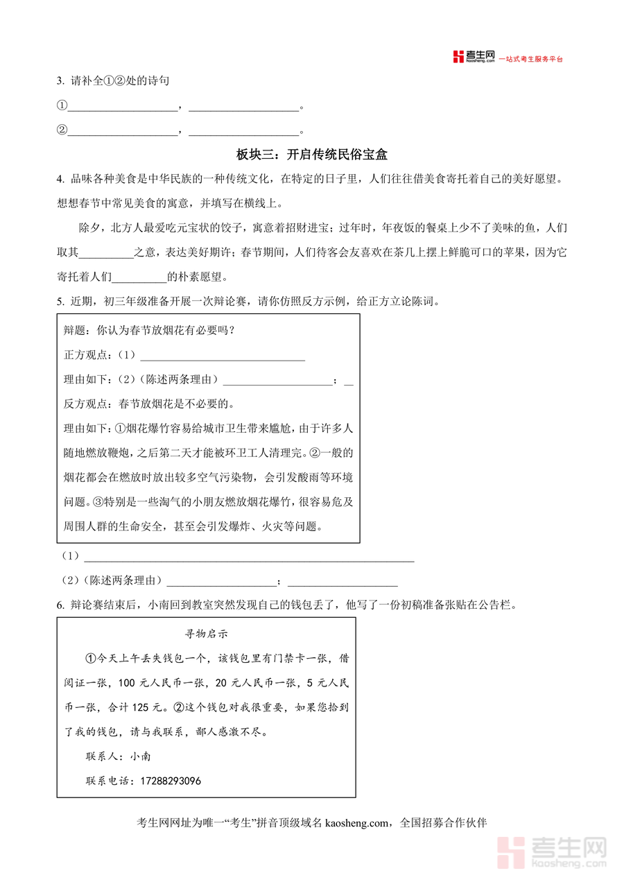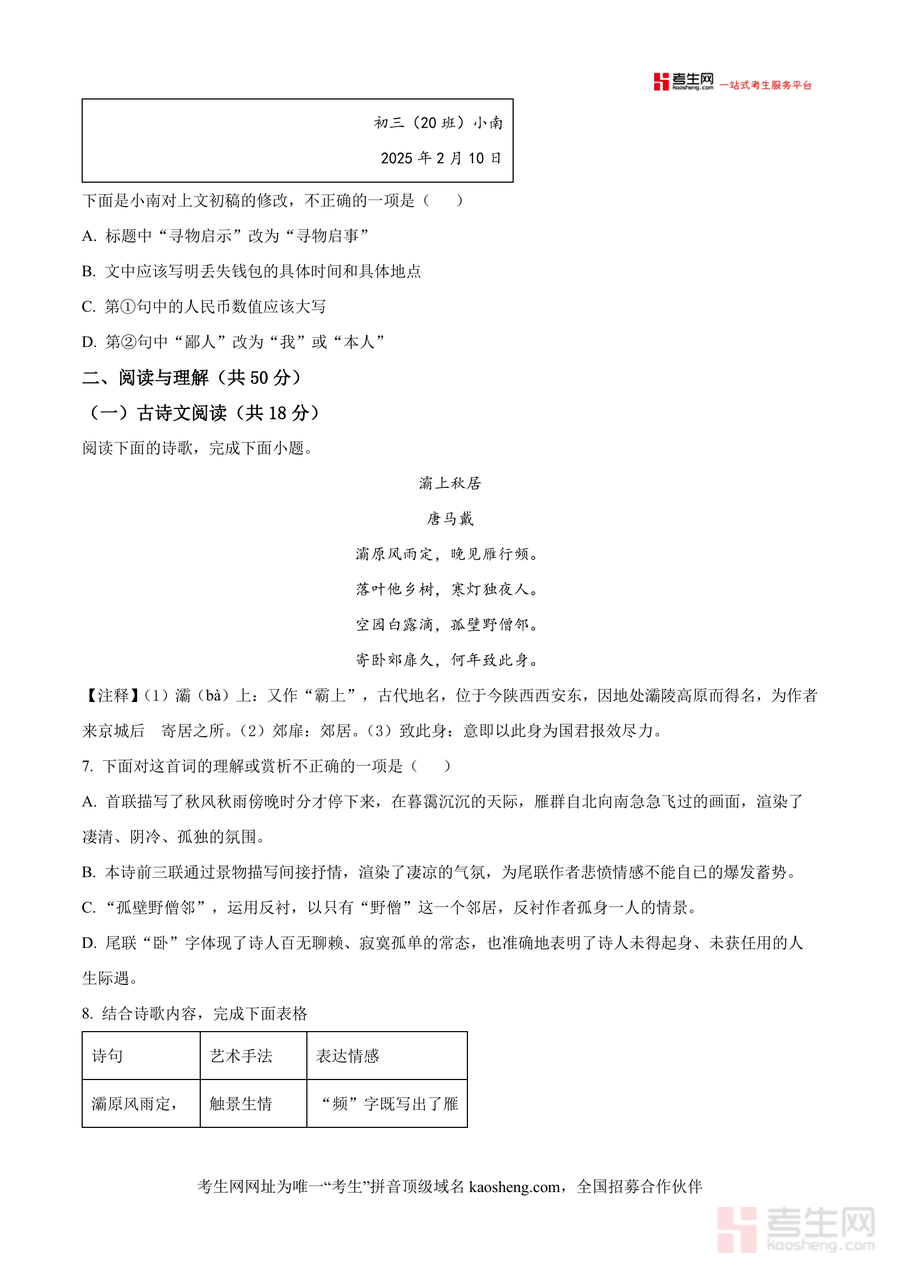 本资料适用于长沙市南雅中学及周边地区九年级学生,以及从事初中语文教学的教师群体,作为一份高质量真题,它不仅具有即时备考价值,更能帮助学生长期积累语文知识,培养传统文化素养,是九年级语文学习过程中不可或缺且不可替代的数据化学习资源,具有持久的参考价值。