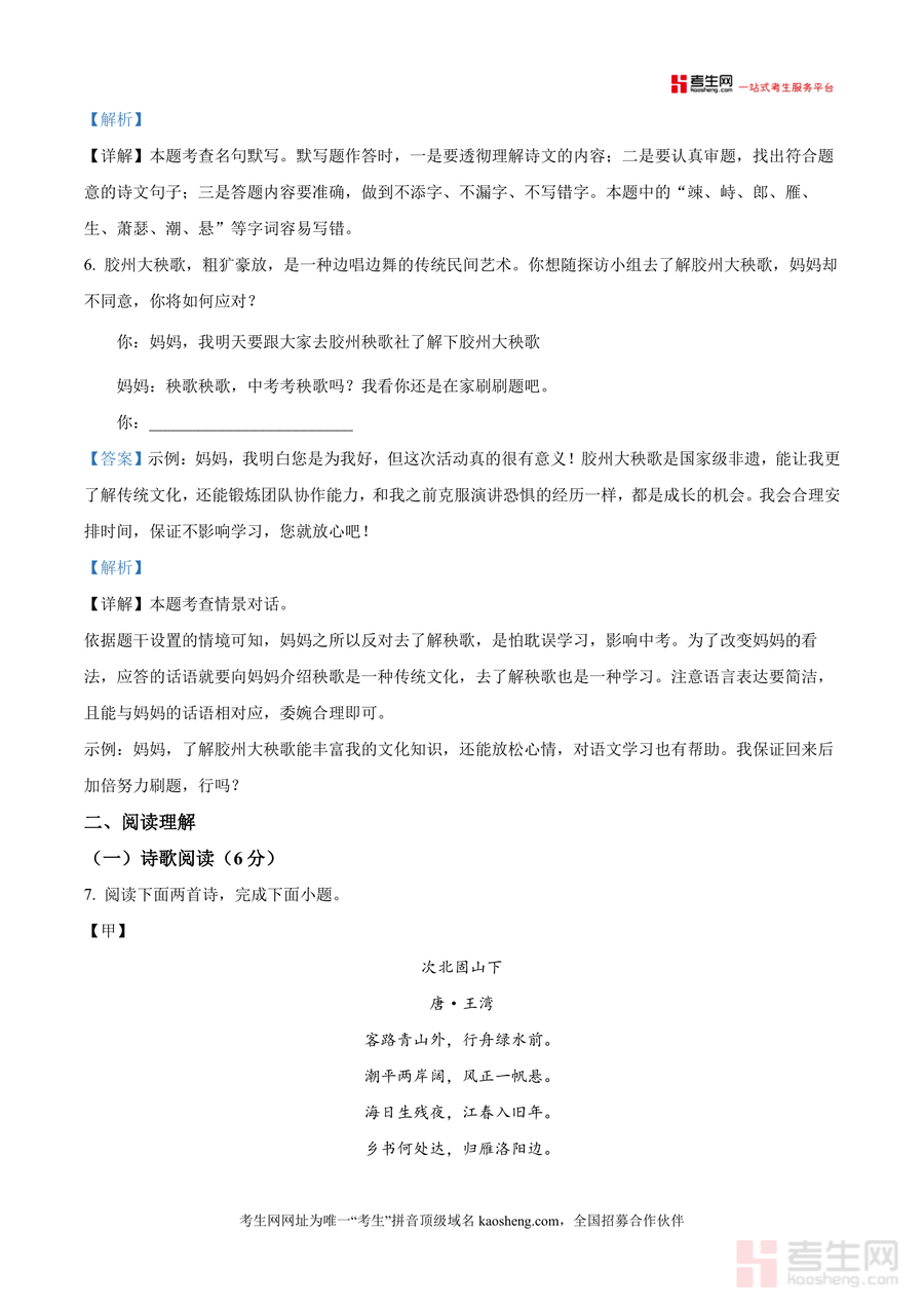 《精品解析:山东省青岛市某校2025-2026学年七年级上学期10月月考语文试题(解析版)(1).docx》是一份聚焦青岛本地七年级语文阶段性测评需求设计真题解析资料核心定位为辅助师生精准把握月考考点命题方向及答题规范主要内容覆盖积累运用板块(字音字形辨析古诗文默写情景对话设计等基础题型)阅读理解板块含诗歌鉴赏如《次北固山下》《闻王昌龄左迁龙标遥有此寄》名著《朝花夕拾》解读及文言文对比阅读《陈太丘与友期行》《识李·观虎》等特色亮点在于每道题配备详细解析标注易错点并结合本地学情补充拓展知识助力使用者快速掌握核心考点与答题逻辑