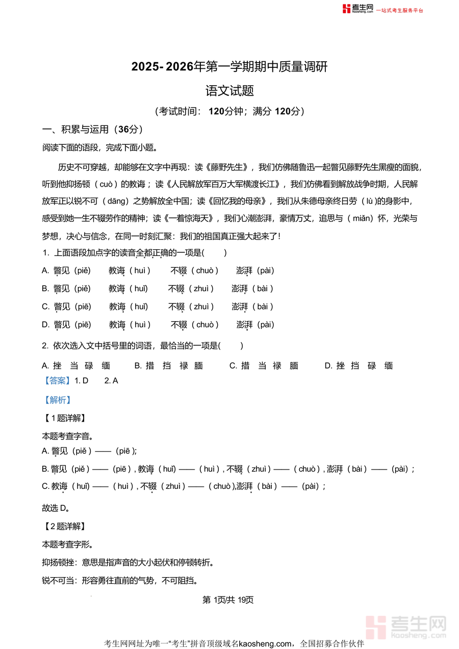 《精品解析:山东省青岛市市南区青岛超银中学2025-2026学年七年级上学期11月期中语文试题(解析版).docx》是一份针对青岛超银中学七年级上学期期中语文考试的精准备考资料,涵盖完整试题原文及逐题深度解析内容,覆盖积累与运用(字音字形、词语辨析、古诗文默写等)、诗歌鉴赏、阅读理解等核心题型;其亮点在于解析过程紧密结合教材知识点与应试技巧,对字音辨析中的易混点、修辞手法赏析中的易错逻辑等进行细致拆解,帮助学生清晰掌握解题思路与得分要点,是兼具权威性与实用性 的真题解析材料.