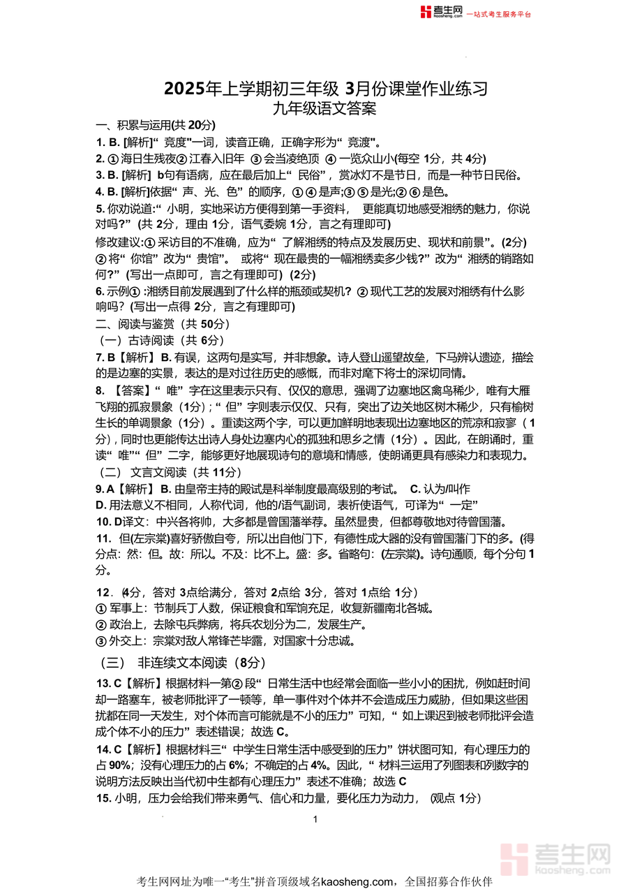 《长沙市明德教育集团2025年3月初三联考语文答案.docx》是一份针对本地初三学生语文联考真题编制专业解析资料核心内容覆盖积累与运用、阅读鉴赏(含古诗、文言文、非连续文本、文学作品、名著阅读五大模块)及写作三大板块特色亮点在于每道题配备详实解析选择题标注正误原因主观题明确得分要点写作部分提供审题指导、思路方向及评分标准自然融入真题解析核心关键词确保学生能精准把握考点