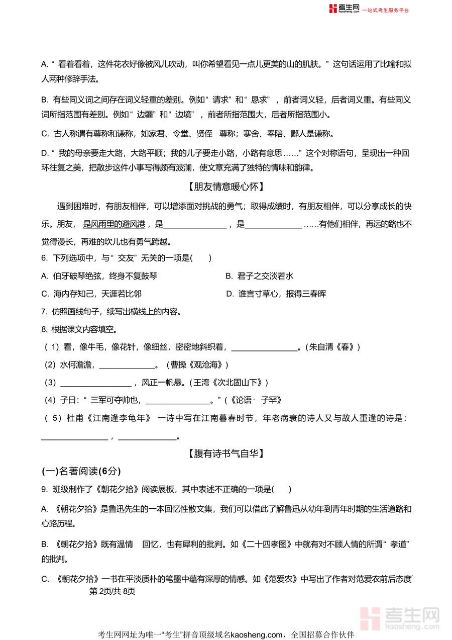 《精品解析:山东省青岛市部分初中学校2025—2026学年七年级上学期期中考试语文试题(原卷版)》是一份针对青岛本地初中起始年级语文期中测评的权威备考资料与真题解析合集,核心定位为贴合区域教学实际与考试要求的工具型资料。其主要内容覆盖七年级上册语文核心考点,包含基础积累运用(字音字形辨析、词语运用、病句修改等)、古诗文默写与阅读(含《春》《观沧海》等课内篇目及岑参《行军九日思长安故园》课外拓展)、文言文对比阅读(结合《论语》经典章节与《李生论善学》拓展文本)、现代文精读(史铁生《秋天的怀念》情感分析题型)及名著导读(《朝花夕拾》人物形象与主题理解)等全题型模块。特色亮点在于严格遵循青岛本地考试时长与分值设置,解析部分针对易错点与得分要点进行详实拆解,兼具原卷呈现与深度分析双重价值。