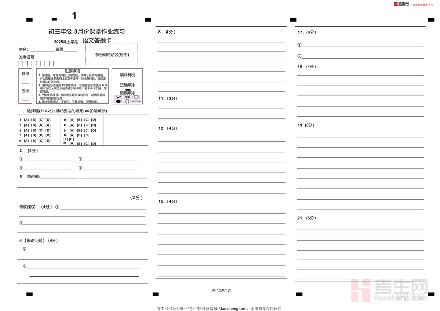 《长沙市明德教育集团2025年3月初三联考语文长沙市明德教育集团2025年3月初三联考语文答题卡.docx》是一份针对明德教育集团初三学生语文联考设计的标准化答题工具。文件严格遵循2025年上学期初三课堂作业练习及联考的题型结构,涵盖选择题填涂区(如第2题、第5题等共22分的填涂区域)、主观题书写栏(如劝说题、阅读分析题等对应答题空间),并包含姓名、班级、准考证号填写栏及页码标注;其特色亮点在于完全匹配联考题目分布与格式要求,确保与实际考试场景高度一致,为学生提供真实的答题体验。