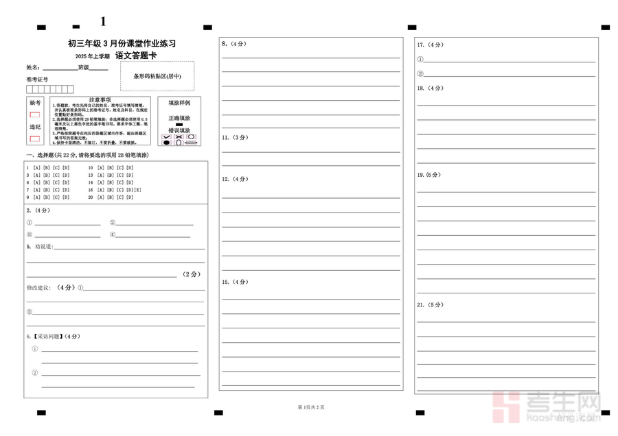 《长沙市明德教育集团2025年3月初三联考语文长沙市明德教育集团2025年3月初三联考语文答题卡(更新).pdf》是一份针对初三学生语文联考的标准化备考资料,核心内容为明德教育集团2025年3月初三联考语文科目的官方更新版答题卡模板。该资料严格遵循联考命题规范,包含完整的答题区域划分(如基础题填空区、阅读主观题答题框、作文方格区等),标注清晰的题号、分值分布及答题注意事项;更新亮点在于优化了部分答题区域的空间布局,适配最新考试阅卷标准,能帮助使用者提前熟悉真实考试的答题卡格式细节。