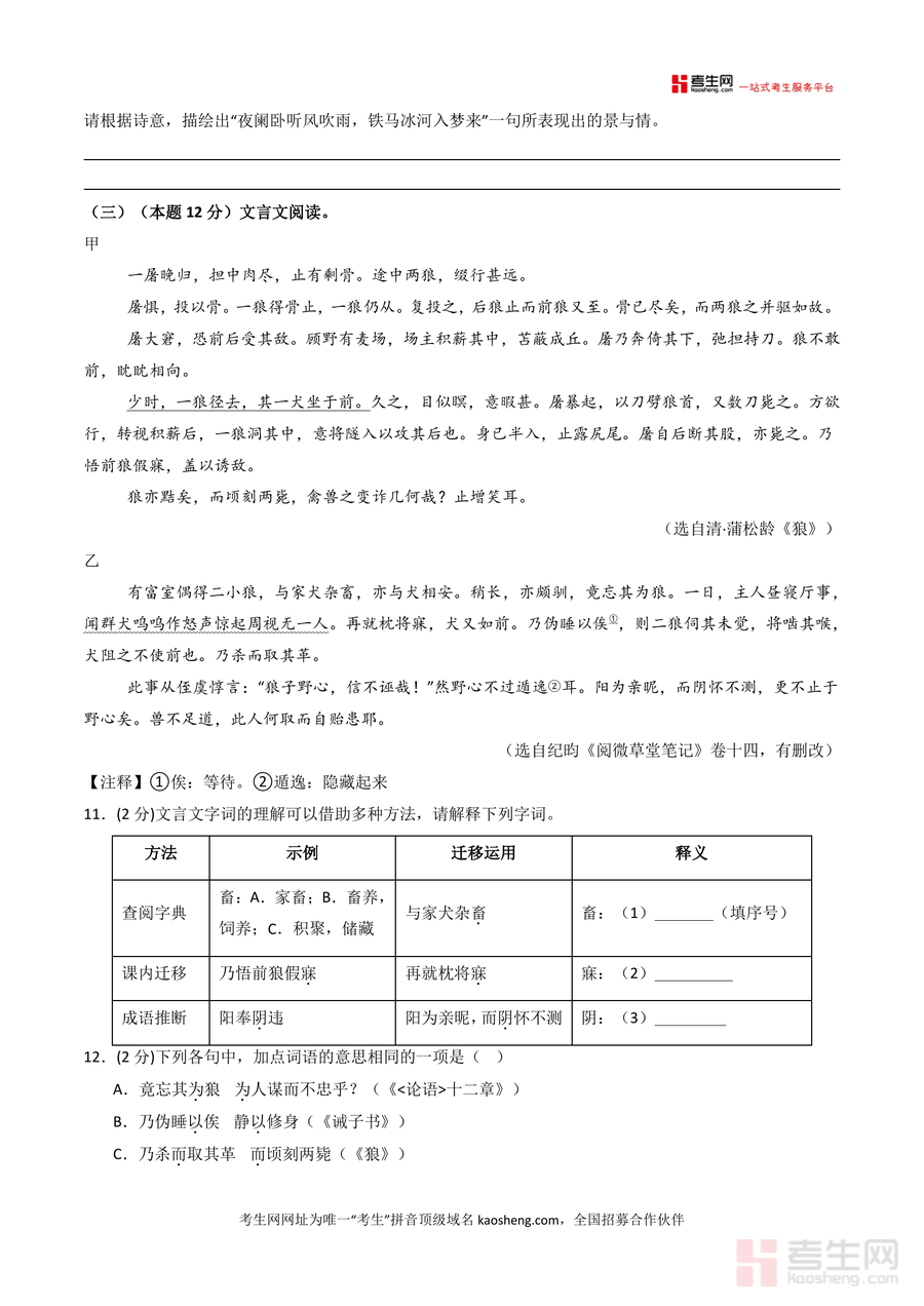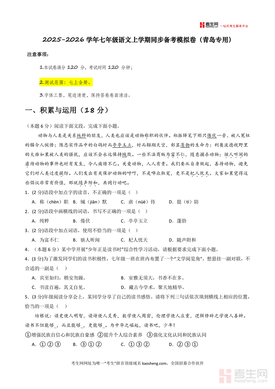 《【青岛专用】期末考试卷(一)-2025-2026学年七年级语文上学期同步备考模拟卷(统编版2024)(原卷版).docx》是一份针对青岛地区七年级语文上学期期末备考设计的专用同步模拟资料,主要覆盖七上全册知识点,包含积累与运用(字音字形、词语运用等)及阅读板块(名著《朝花夕拾》《西游记》阅读题,诗词鉴赏,文言文双篇对比阅读,非连续文本阅读,文学类文本阅读)等题型;其特色亮点在于精准适配青岛本地考情,严格遵循统编版2024教材要求,以原卷版形式呈现还原真实考试场景,帮助使用者快速熟悉考试框架与内容。