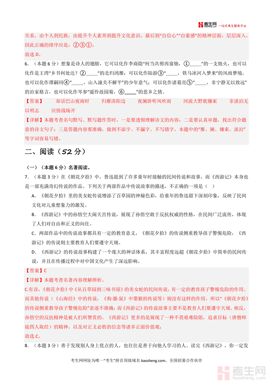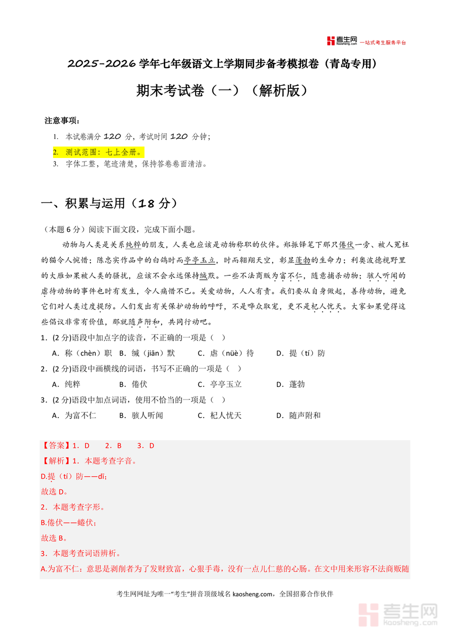 《【青岛专用】期末考试卷(一)-2025-2026学年七年级语文上学期同步备考模拟卷(统编版2024)(解析版).docx》是一份专为青岛地区七年级学生打造、贴合统编版2024教材要求的期末考试备考资料;内容全面覆盖七上全册知识点包括积累运用板块(字音字形词语辨析、名句默写、综合性学习等题型)、阅读板块(名著阅读《朝花夕拾》《西游记》、诗词阅读陆游作品、文言文阅读《狼》等经典篇目)及写作相关训练方向;特色亮点在于每道题均配备详细解析如字音题明确错误读音及正确读法、词语题分析褒贬色彩与语境适配性、名著题结合原著情节深度解读助力学生理解考点本质。