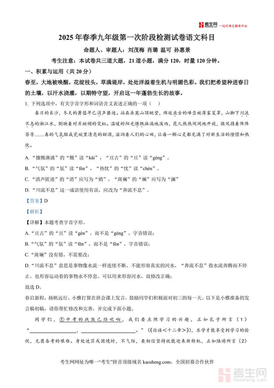 《精品解析:湖南省长沙市雅礼部分学校2024-2025学年九年级下学期3月月考语文试题(解析版).docx》是一份聚焦初三语文阶段性备考需求的高质量真题解析资料,核心定位为雅礼系学校月考真题深度解读,覆盖积累与运用(字音字形、古诗文默写等)、阅读与鉴赏(古诗文对比赏析、现代文阅读等)两大核心模块;主要内容含完整试题及逐题精准解析,特色亮点在于解析既给标准答案又附带考点溯源、答题思路梳理及易错点警示,如针对"川流不息"成语使用场景辨析时明确其适用范围与"奔流不息"差异,助力学生精准掌握知识点本质