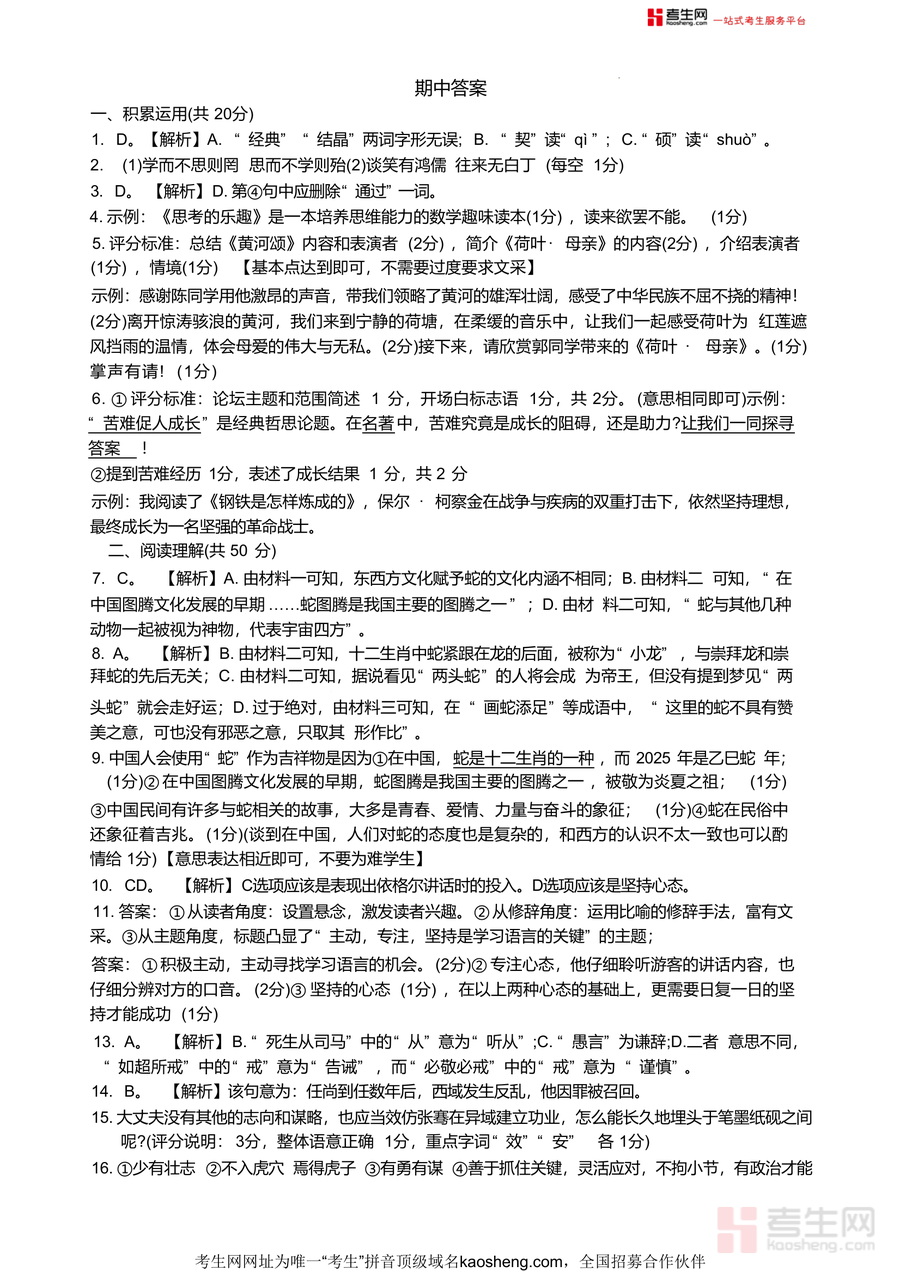 该资料核心用途为辅助九年级学生高效备考期中语文考试,适用场景包括日常练习后的答案核对与错题分析、考前针对性复习薄弱环节、教师备课参考校本题型设计等;用户价值体现在帮助学生快速掌握该校期中命题规律,提升应试能力,如通过解析中的考点梳理,学生可明确积累运用模块的得分要点,以及阅读理解中不同题型的答题技巧;备考优势在于其与华益中学期中考试的高度适配性,能让学生提前熟悉本校考试题型与难度,避免复习方向偏差,有效提升备考效率。