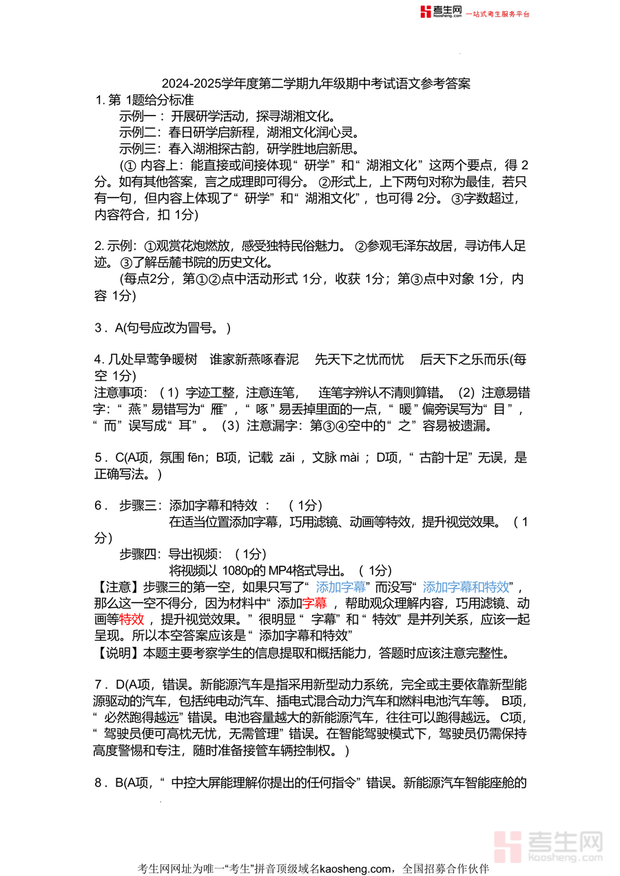 《2024-2025学年度第二学期九年级期中考试语文参考答案(最终版).docx》是一份针对九年级语文期中考试设计的权威备考资料,涵盖全卷各题型精准答案及详细评分标准,包括基础积累题字词书写规范与古诗文默写要点、阅读题选项解析及主观题答题方向,如第1题明确"研学"与"湖湘文化"双要点给分规则,第11题细化修辞手法分析得分维度,同时附带易错点提示(如"燕""啄"等字词书写误区)与题型能力考察说明(如信息提取概括能力要求),为师生提供全面专业的参考支持。