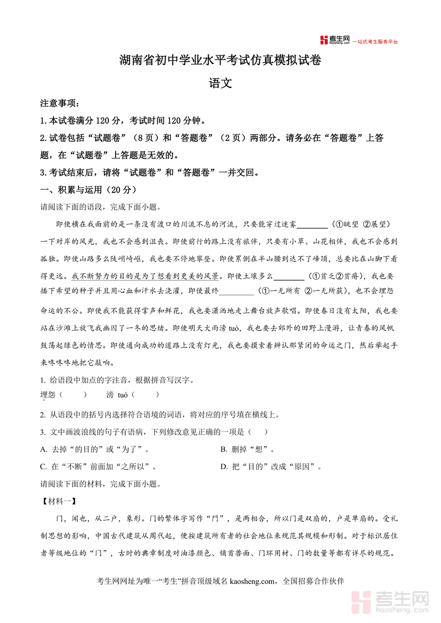 《精品解析:2025年湖南省长沙市三校初中学业水平考试仿真模拟语文试卷(原卷版).docx》是一份面向长沙地区初三学生打造、深度贴合本地中考考纲要求且整合三校优质教研资源而成专业备考资料;包含积累与运用(字音字形辨识、词语语境选择等)、阅读(现代文I/II、文言文)及写作等核心模块,题型严格遵循长沙中考真题结构,选材兼顾经典文本与时代热点能高度还原真实考试场景与命题风格