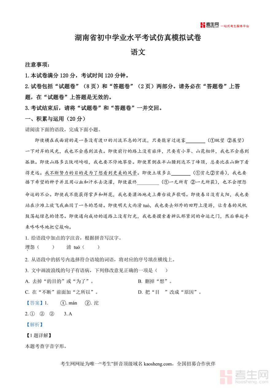 《精品解析:2025年湖南省长沙市三校初中学业水平考试仿真模拟语文试卷(解析版).docx》是一份精准对接长沙中考考纲与三校联考命题趋势的专业语文备考资料;其主要内容涵盖积累与运用(字音字形如"埋怨"注音"滂沱"字形、词语辨析如"眺望/展望"选择、病句修改如"目的是为了"句式杂糅)、现代文阅读(古代书信专题)等中考核心板块,题目设置严格遵循长沙中考语文试卷结构与分值分布;特色亮点在于每道题配备详尽解析,包括考点定位、答题思路拆解及易错点警示,帮助考生精准掌握知识点本质而非机械记忆答案。