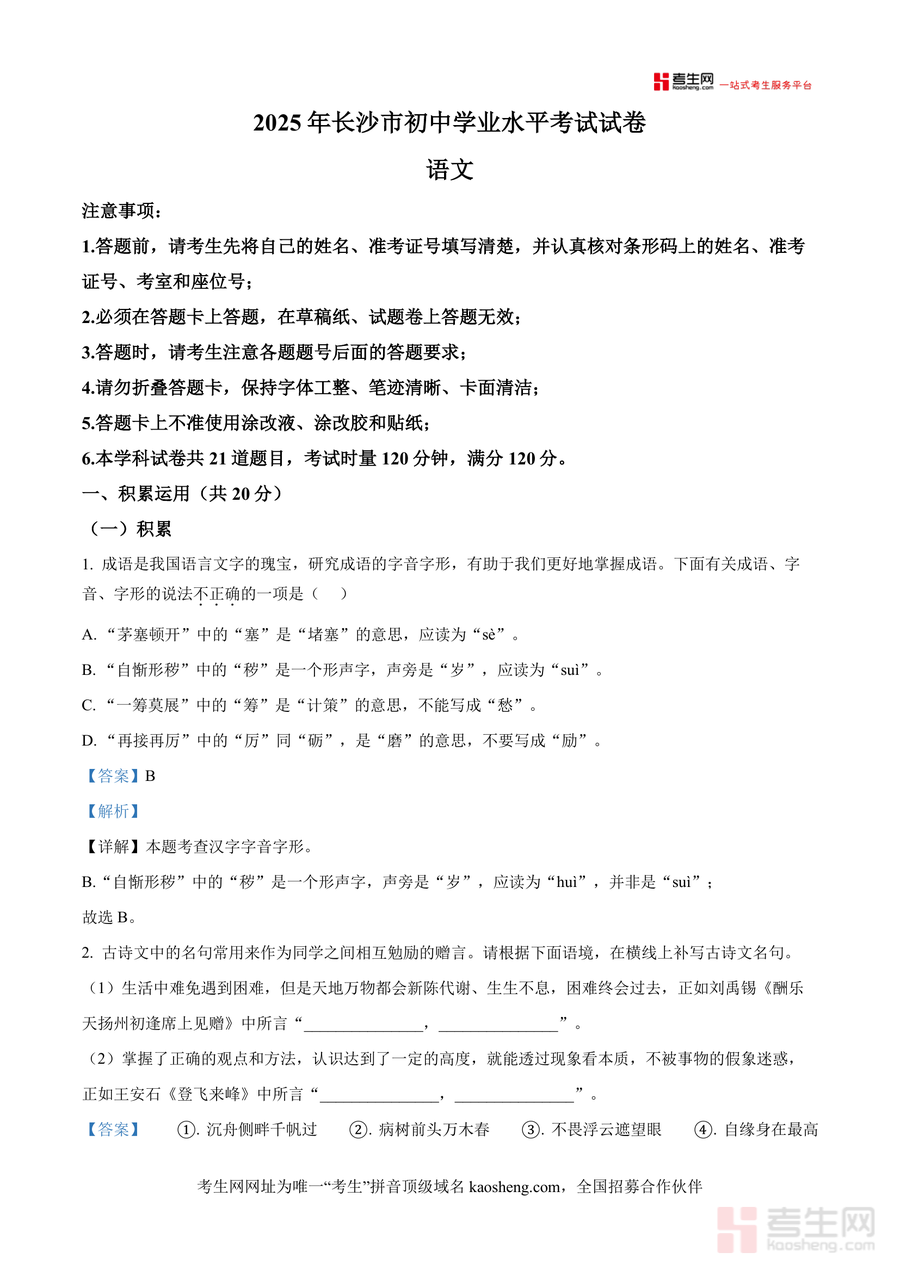本资料适用于2025年长沙中考语文考生、初三语文教师及中考辅导机构人员。作为当年最新真题解析资料,其必要性在于直接反映命题趋势与难度梯度,不可替代性体现在针对本地考情(如地域文化元素融入)设计专业解读,长期价值则为后续备考提供考点规律参考;无论是考生冲刺提分还是教师优化教学,均为不可或缺且高效实用工具性资料,助力提升备考与教学质量。