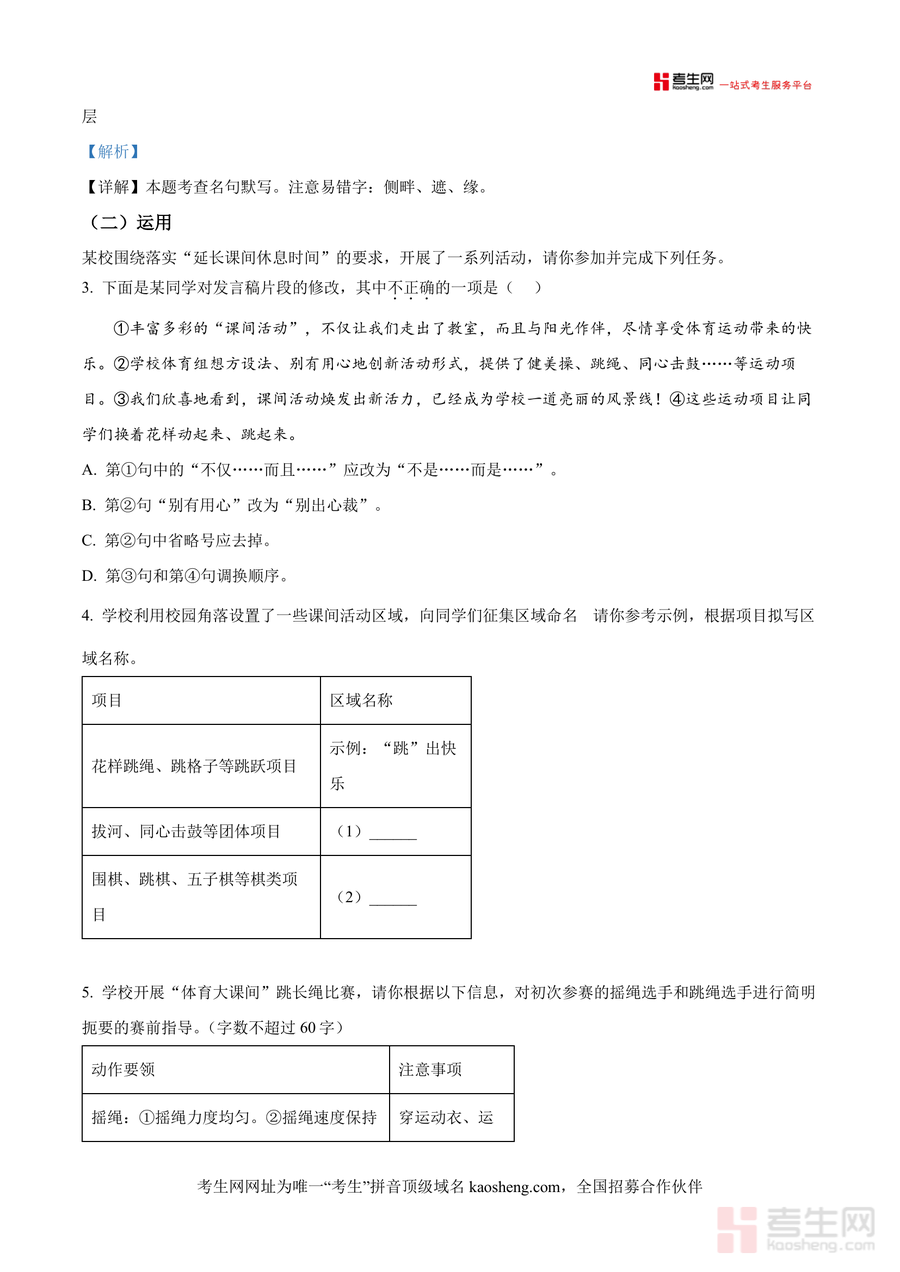该资料主要用于考生熟悉长沙中考语文命题规律与题型特点,适用于日常练习后的错题分析(如积累运用题错误归因)、考前冲刺阶段真题模拟(还原考试场景)及教师教学参考(考点梳理与例题设计)。通过深度解析,考生可提升应试能力:如掌握古诗文默写语境适配方法,阅读理解题信息提炼与跨学科迁移技巧,实践类题目(如课间活动指导)表达简洁性训练;其备考优势在于精准对接长沙本地考情,避免复习偏差,高效提升得分能力与答题效率。