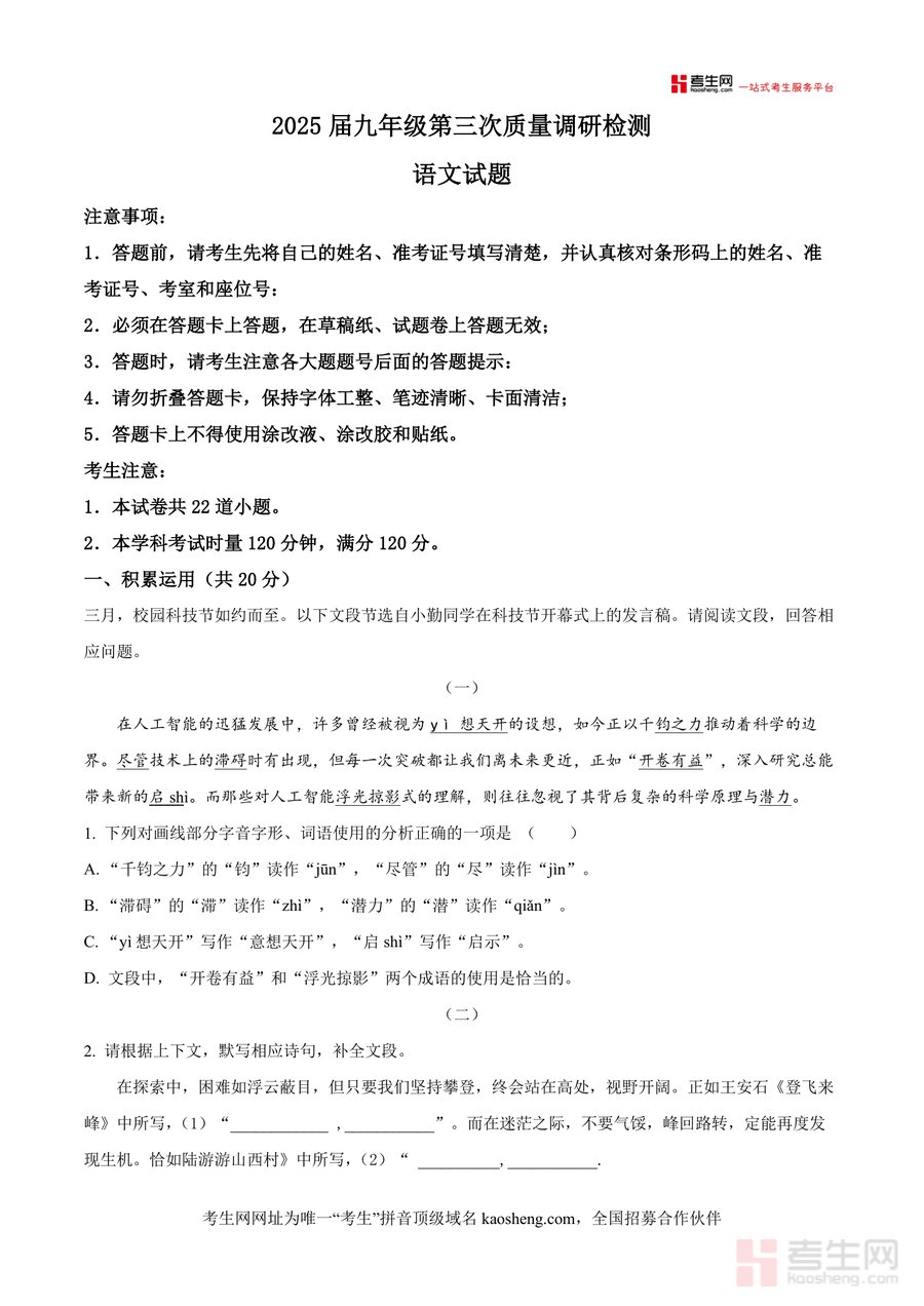 《精品解析:2025年湖南省长沙市湖南师大附中教育集团中考一模语文试题(解析版).docx》是一份针对长沙地区九年级学生中考语文备考的数据处理类专业真题解析资料,核心内容涵盖2025届湖南师大附中教育集团第三次质量调研检测语文试题原题及全题型详细解析,包括积累运用(含科技主题语境下的数据处理题型)、古诗文阅读(如南宋方岳《听雨》赏析)、现代文阅读等中考核心模块,特色亮点在于解析部分不仅提供精准答案,还对每道题目的考点来源(如字音字形辨析逻辑)、答题思路(如病句修改规则)、易错点提醒(如成语使用语境适配性)进行深度拆解,帮助考生把握本地命题规律与评分标准,提升对真题考点分布的认知。