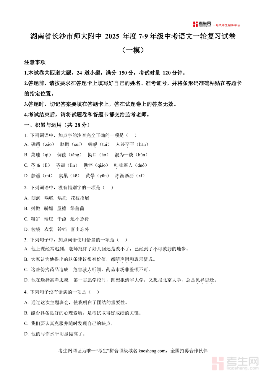 本资料适用于湖南省长沙市及周边地区初三语文教师与备考学生,尤其对目标冲击优质高中的学生具有重要参考价值。作为一份来自名校的权威模拟试题,它不仅是初三学生一轮复习阶段不可或缺且不可替代备考资料,更是帮助学生查漏补缺巩固基础得关键工具,其长期价值在于引导学生掌握规范答题方法培养良好应试习惯,助力学生在中考语文科目中发挥最佳水平,为最终取得优异成绩奠定坚实基础,具有极高实用意义与指导作用,能有效提升学生备考质量与应试竞争力!