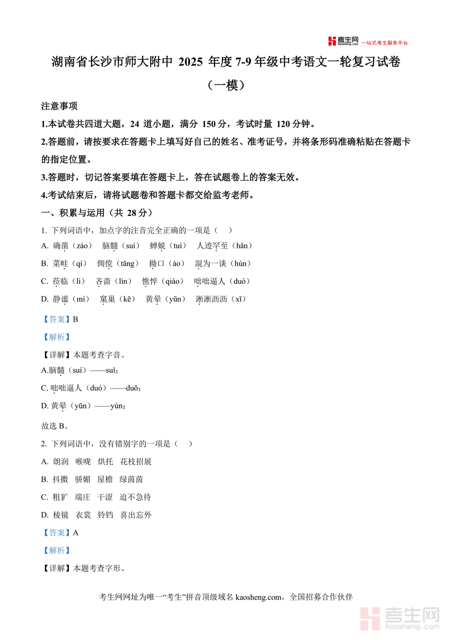 《精品解析:2025年湖南省长沙市湖南师范大学附属中学中考一模语文试题(解析版).docx》是一份针对长沙市中考语文一轮复习阶段设计的高质量备考资料,聚焦师大附中一模真题展开深度解析。资料涵盖积累与运用、阅读(含文言文)、综合性学习等中考核心模块,每个题目均配备精准解析:字音字形题标注易错读音与字形修正,成语运用题分析感情色彩与语境适配性,病句题明确病因类型(如成分残缺、两面对一面),文学文化常识题辨析常见误区(如安徒生作品与格林童话区别),古诗文默写提示易错字,文言文阅读对比分析"信"主题在人际交往与治军的意义,全面覆盖中考考点。