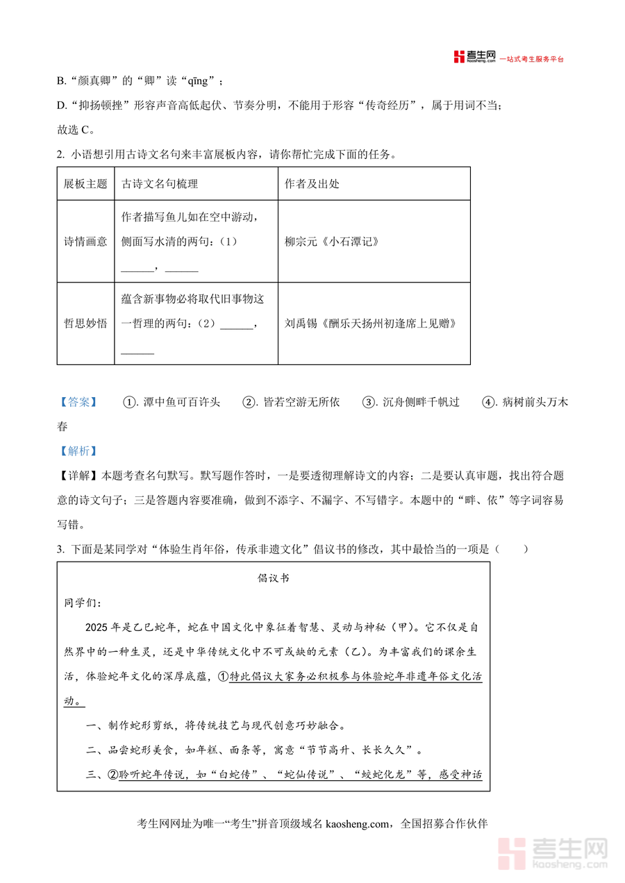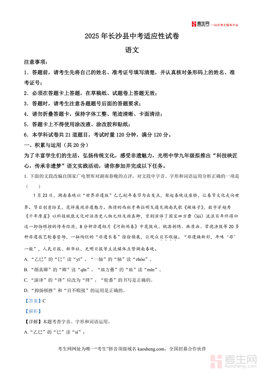 《精品解析:2025年湖南省长沙市长沙县中考一模语文试题(解析版).docx》是一份聚焦长沙县中考语文备考需求,融合真题训练与深度解析的专业备考资料,涵盖积累与运用(字音字形辨析、古诗文默写、活动方案设计等题型)、阅读理解(非文学作品阅读如岳麓书院/爱晚亭/贾谊故居相关材料)两大核心模块;特色在于解析内容深度嵌入长沙本地非遗文化(如铜官窑研学活动)与历史人文元素,每个题目均配备精准答案及知识点拓展(如古诗文默写易错字提醒),助力考生全面把握考点细节与命题逻辑。
