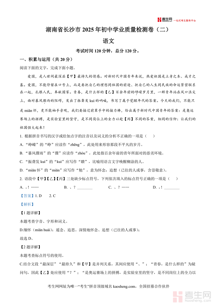 《精品解析:2025年湖南省长沙市长郡集团中考二模语文试题(解析版).docx》是一份聚焦长沙中考考纲与长郡集团命题特色 的权威备考资料,涵盖积累与运用(如字音字形辨析、标点符号运用)、古诗文阅读(文天祥《金陵驿》赏析、苏轼散文对比阅读)等核心题型,每道题目均配备详实解析——包括考点定位、错误选项深度分析及解题思路指引(例如对"振聋发聩"字形纠正及"缅怀"词义解读),助力学生精准掌握知识点与答题技巧,是兼具实用性与专业性 的真题解析资料.