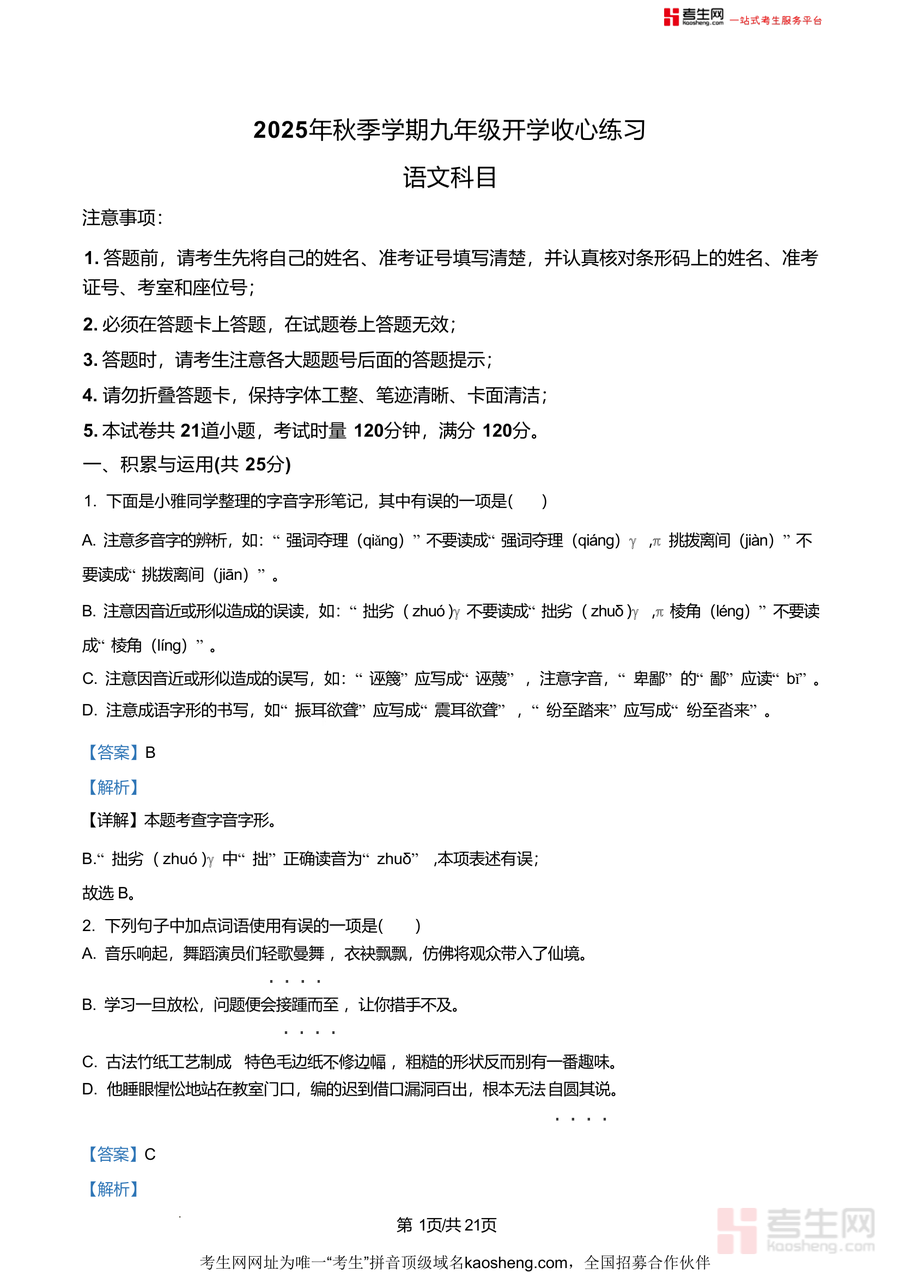 《精品解析:湖南省长沙市中雅培粹学校等校联考2025-2026学年九年级上学期入学考试语文试卷(解析版)docx》是一份聚焦长沙地区九年级入学阶段语文能力测评的专业备考资料。该资料收录完整联考真题及逐题深度解析,覆盖积累与运用(字音字形、成语病句等)、阅读与鉴赏(古诗词鉴赏、综合性学习等)核心模块,特色在于解析过程结合命题意图与答题技巧,如对"和"文化主题综合性学习题的情境化解读,以及名句默写易错点标注,助力学生精准把握考点规律