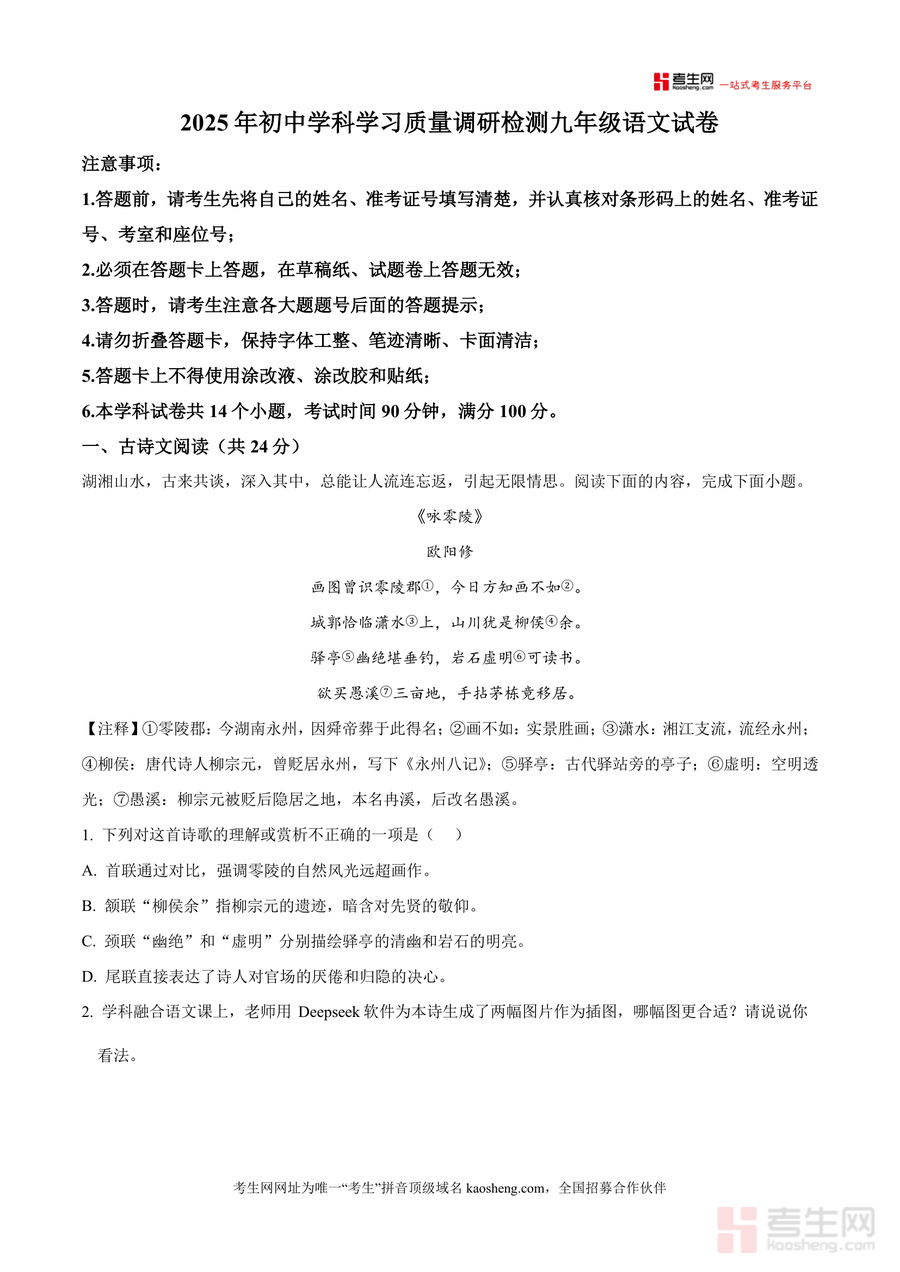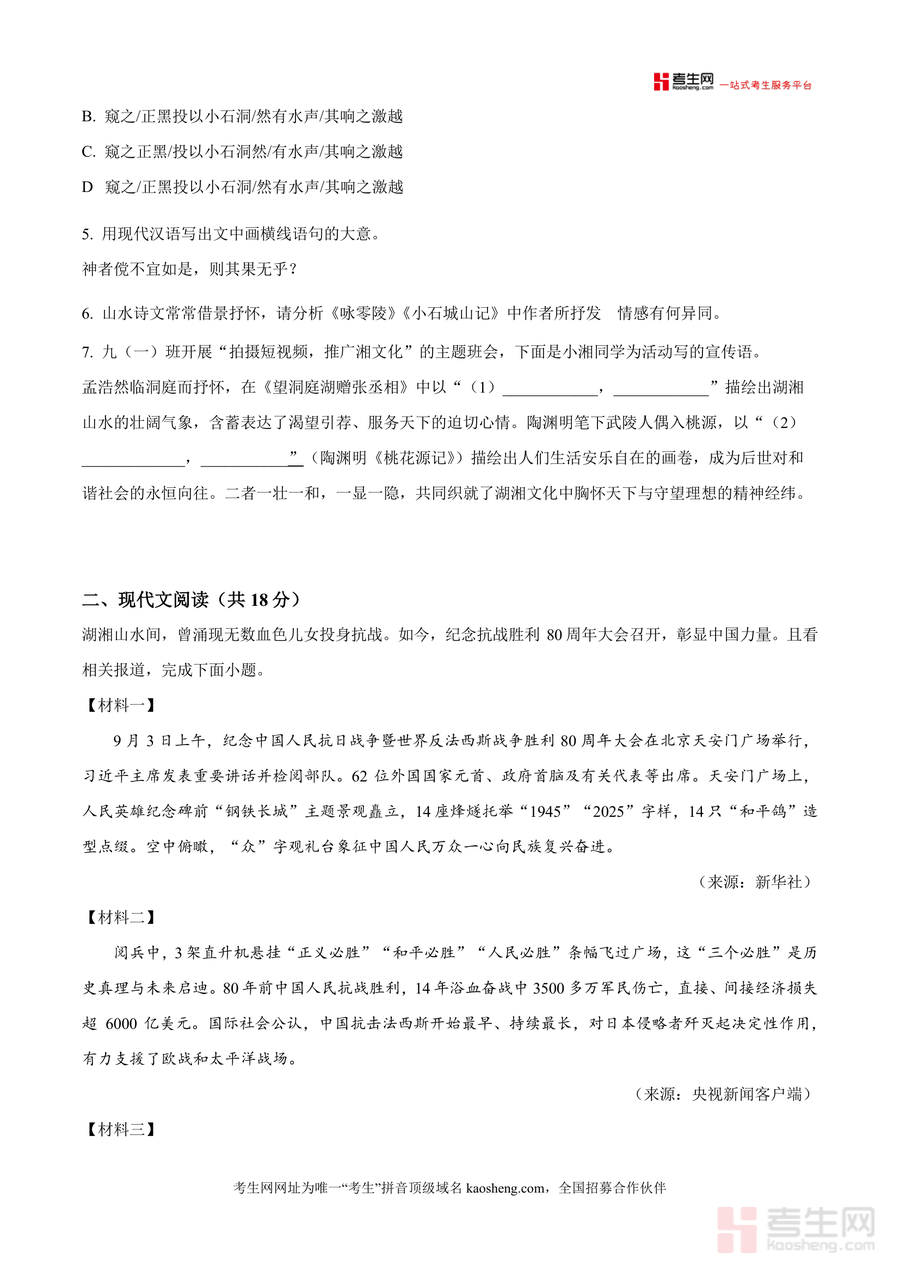 《精品解析:湖南省长沙市天心区联考2025-2026学年九年级上学期9月月考语文试题 (原卷版).docx》是一份针对长沙市天心区九年级上学期9月联考设计的语文备考资料,涵盖古诗文阅读(含欧阳修《咏零陵》及柳宗元《小石城山记》等湖湘文化相关篇目)、现代文阅读(抗战胜利80周年主题材料)、名著阅读(《红星照耀中国》片段)及写作(“心中灯火”)四大模块,严格遵循考试注意事项(90分钟满分100分)与题型设置规律,并突出湖湘地域文化特色与学科融合导向(如Deepseek软件插图适配题)等亮点设计,为考生提供贴合本地联考命题趋势且内容详实的真题素材与解析依据