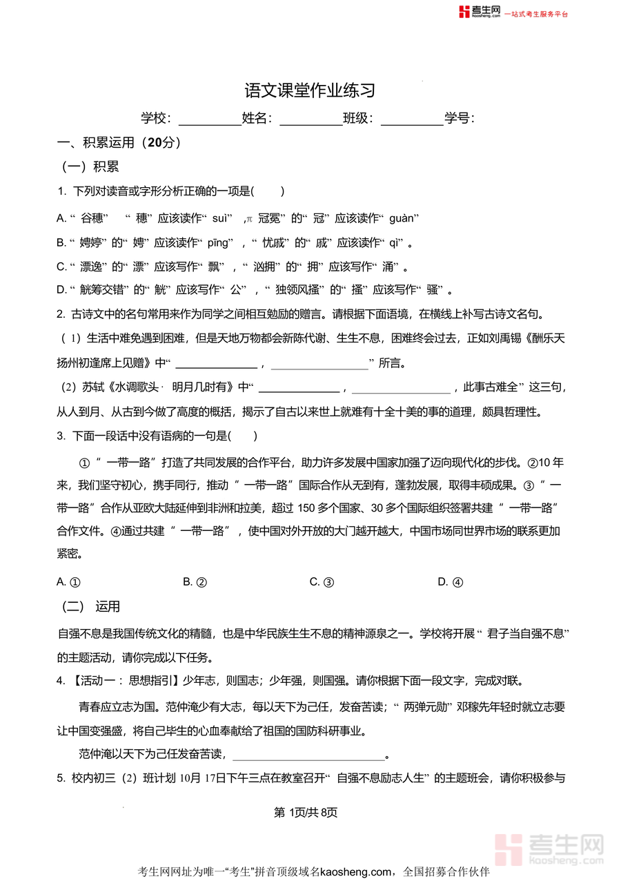 本资料适用于长沙市明德教育集团及周边区域九年级学生、语文教师及备考家长.九年级上学期是中考备考关键起步阶段,10月课堂作业作为阶段性学习效果反馈载体,具有不可替代必要性——能及时发现前期学习薄弱环节,避免知识漏洞积累;长期价值体现在:学生可将典型题型与易错点整理成错题集,作为中考复习阶段重要参考资料,持续提升语文综合素养与应试竞争力,为最终中考优异成绩提供有力支撑.