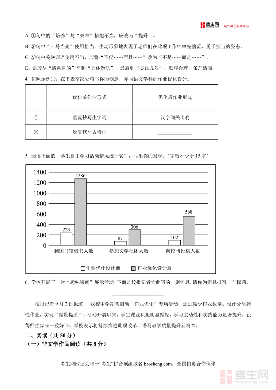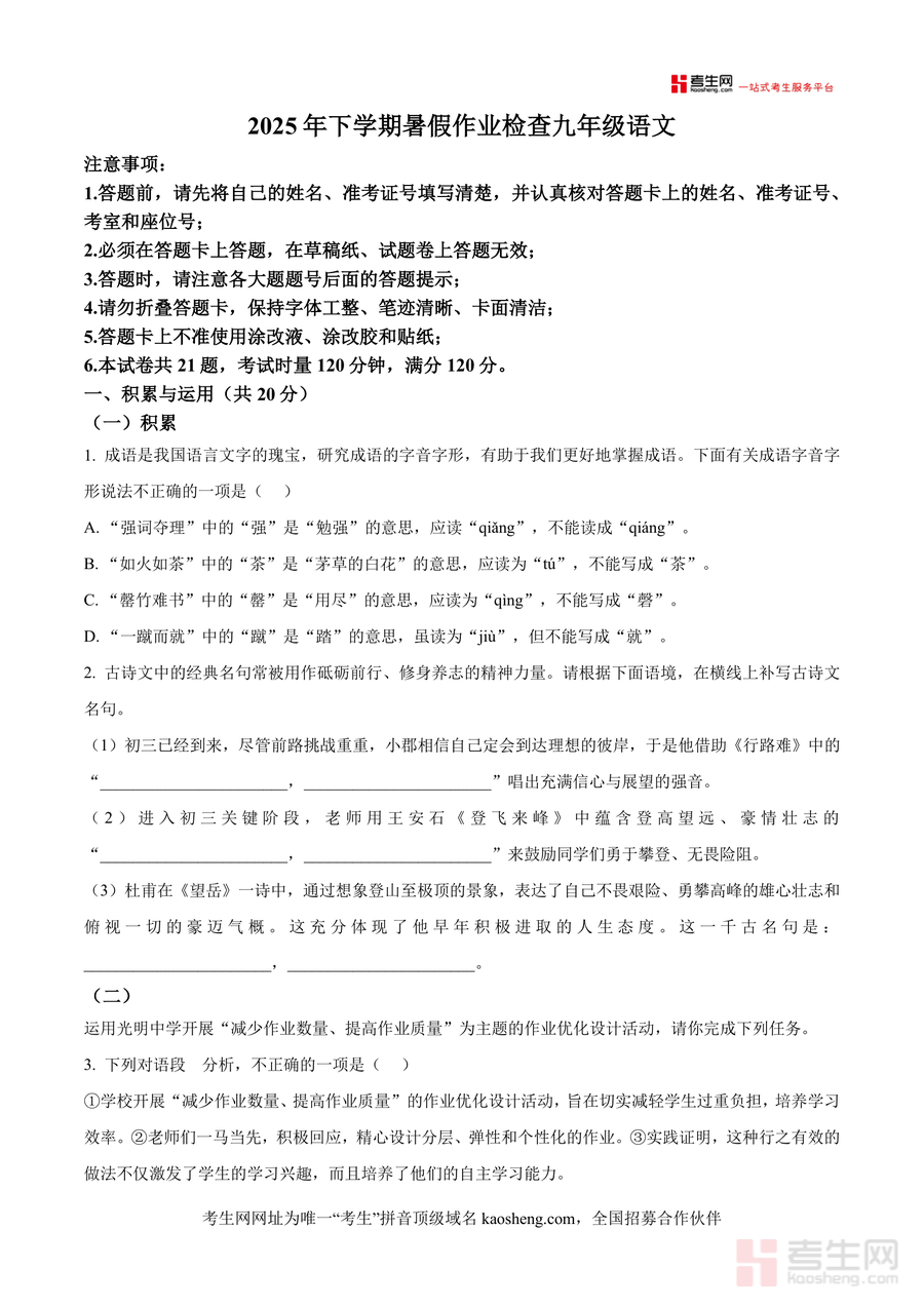 本资料适用于长郡雨花外国语学校九年级新生、长沙地区同年级希望参考优质真题提升语文能力者,以及从事初中语文教学的教师;作为衔接八年级与九年级语文学习、适应新学段考试要求不可替代工具,它不仅助力学生快速进入九年级学习状态,更能长期服务于中考语文备考,为后续学习奠定坚实基础,是兼具即时性与长效性价值教育资源。