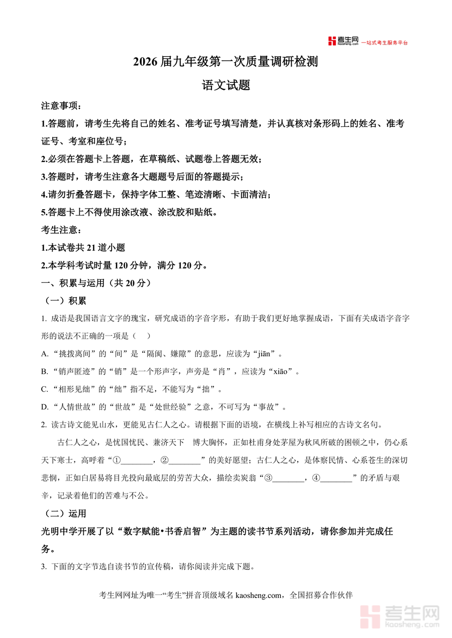 《精品解析:湖南省长沙市附中集团2025-2026学年九年级上学期开学考试语文试题(原卷版).docx》是一份针对长沙附中集团九年级语文开学检测设计制作权威备考资料,其内容严格遵循当地中考语文命题框架与校际联考标准,涵盖积累与运用(字音字形辨析、古诗文默写、语言运用任务)、阅读(非文学作品、文学作品、古诗文)等完整题型模块,全面覆盖九年级上册核心知识点与能力考查点;特色在于完整保留考试原题原貌,包括注意事项、题型分布及分值设置等细节,精准还原真实考试场景,为使用者提供沉浸式练习体验,助力快速适应校考命题逻辑