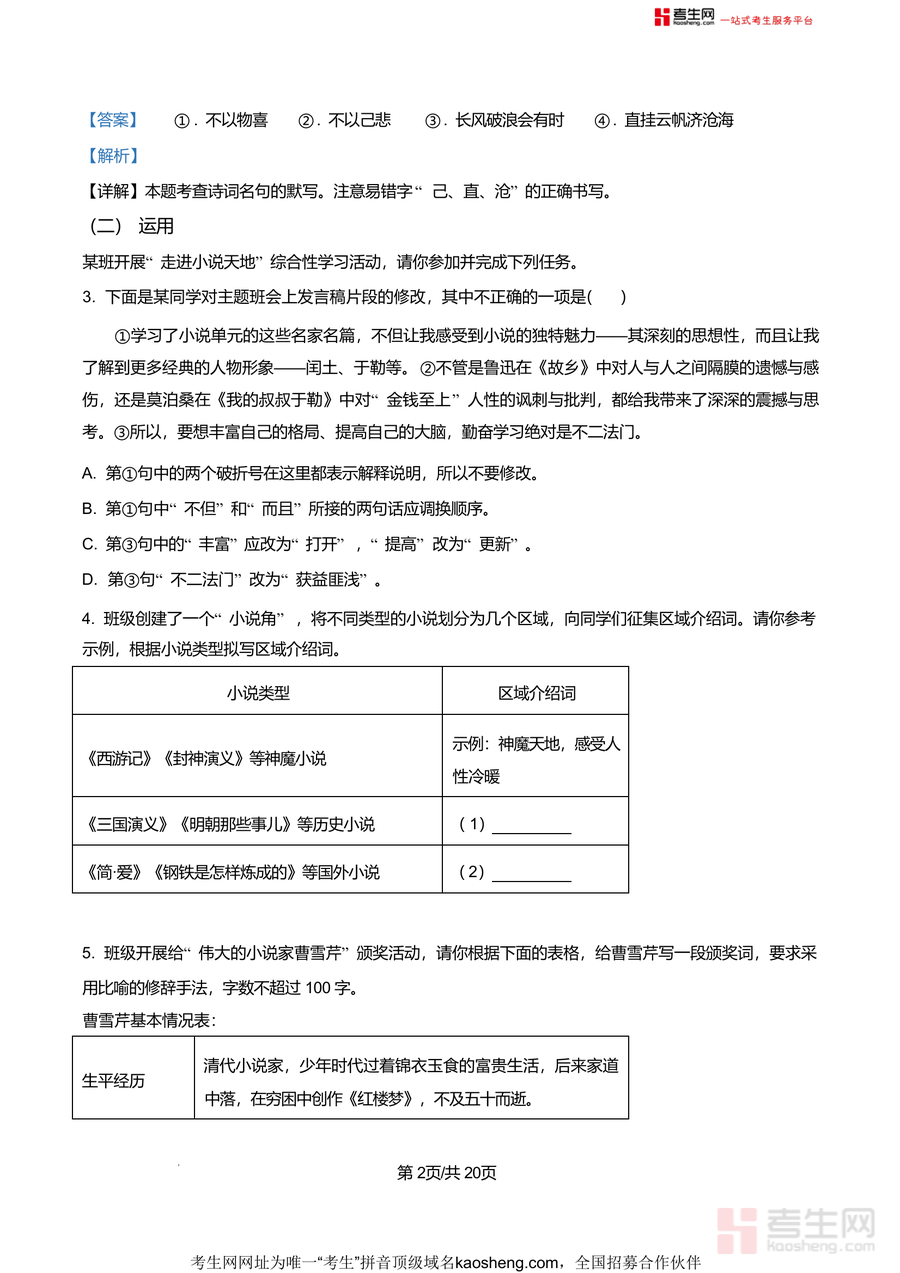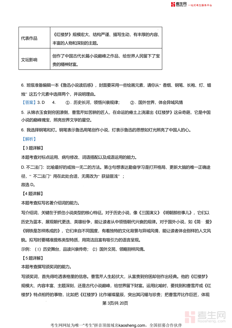 该资料核心用途在于辅助九年级学生高效备考月考,使用场景涵盖日常课后巩固练习、考前针对性冲刺复习及错题归因分析。其用户价值体现在通过名校真题训练提升应试能力,借助详实解析弥补知识漏洞,例如非文学作品阅读题中对选项错误点逐项剖析,能帮助学生掌握阅读题答题技巧;同时,资料贴合长沙地区初中语文教学进度与命题趋势,备考优势显著,可有效缩短学生盲目刷题时间,提升复习效率。