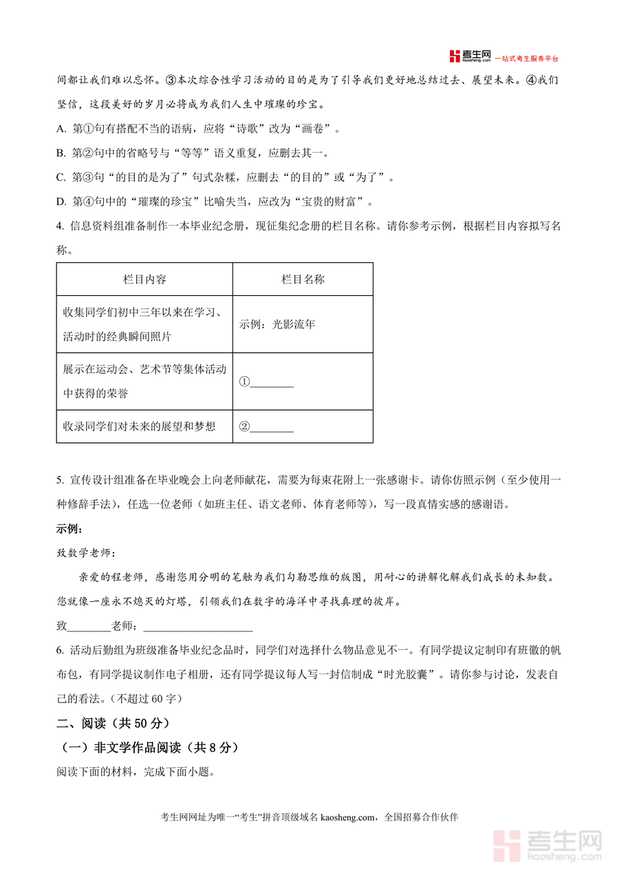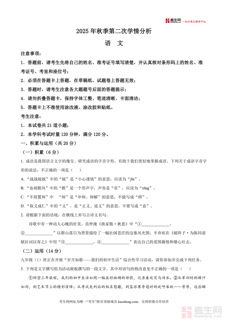 《精品解析:湖南省长郡教育集团2025-2026学年九年级上学期第二次月考语文试题(原卷版).docx》是一份聚焦九年级语文阶段性学情检测需求、贴合湖南本地教学实际与中考命题趋势 的优质备考资料。文件涵盖积累与运用、非文学作品阅读、文学作品阅读及古诗文阅读四大核心模块,包含字音字形辨析、古诗文默写、病句修改、综合性学习设计及现代文与古诗文鉴赏等关键考点,依托长郡教育集团深厚教研资源,命题兼具基础性与能力性,题型设置高度贴合中考真题形式,能全面反映学生阶段性知识掌握水平