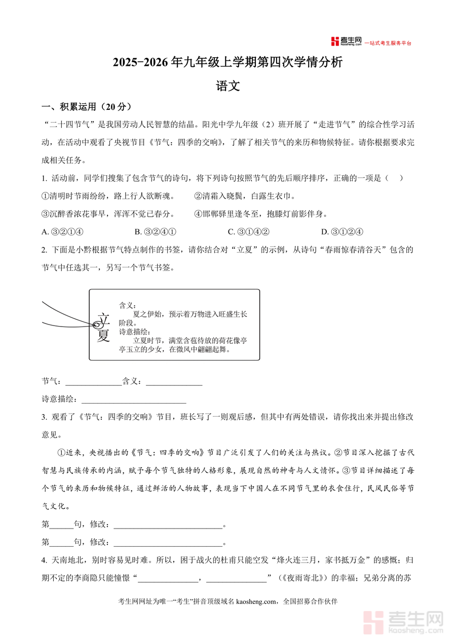 《精品解析:湖南省长郡教育集团2025-2026学年九年级上学期第四次学情分析语文试题(原卷版).docx》是一份聚焦九年级语文阶段性学情评估高质量备考资料依托长郡教育集团深厚教研资源编制涵盖积累运用、现代文阅读、诗歌阅读等核心模块;其特色在于贴合新课标要求设计综合性学习任务(如二十四节气主题活动题)与生活情境类试题保留原卷真实命题逻辑与难度梯度为考生提供精准对标名校学情检测标准参考依据;同时试题融入传统文化元素与时代主题让考生在练习中实现语文素养提升与应试能力培养双重目标