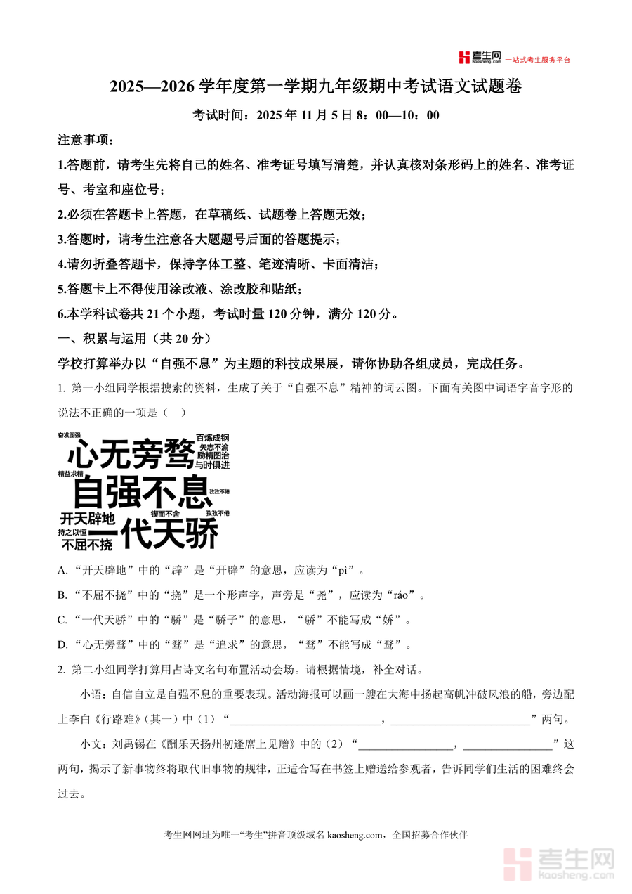 《精品解析:湖南省长沙市一中教育集团2025-2026学年九年级上学期期中语文试题(原卷版).docx》是一份聚焦九年级语文期中备考 的权威真题资料,依托长沙一中教育集团优质教研资源编制而成,完整呈现120分钟考试时长、120分满分的标准化结构,涵盖积累与运用(如"自强不息"主题活动设计)、非文学作品阅读(AI文旅应用素材)、文学作品阅读(《八女投江》节选)及古诗文阅读四大核心模块,命题贴合新课标要求且兼具时代性,保留真实答题规范与题型细节,为考生提供沉浸式真题体验场景,助力把握命题逻辑与题型特点,是优质真题解析类备考资料之一.